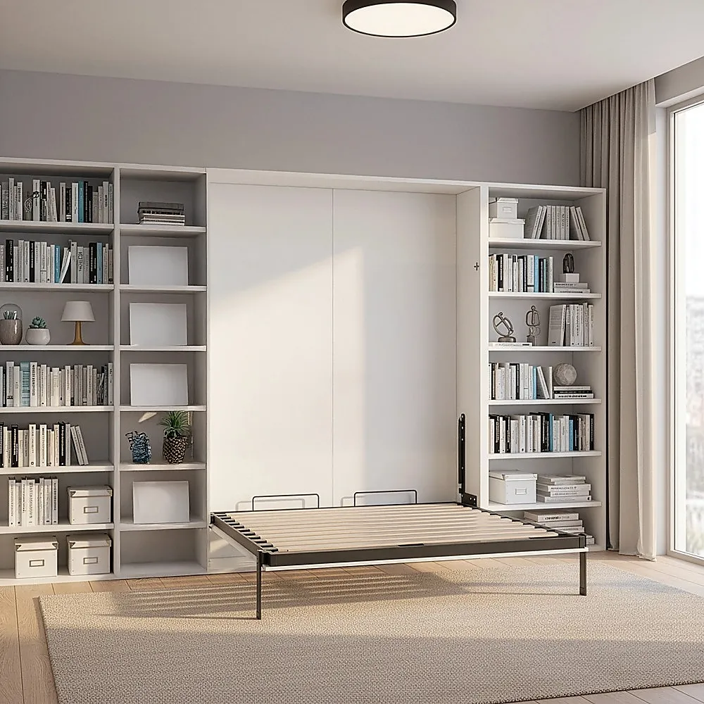 Designed for custom builds, this Murphy bed kit is perfect for turning your spare room, home office, or studio into a multi-purpose space. The durable steel frame with powder-coated finish ensures long-lasting strength, while pneumatic pistons make lifting easy. Features include high-quality slats, automatic folding legs, and a slow-fall safety system for secure use. The included sleek metal door handle adds a premium touch to your cabinetry.