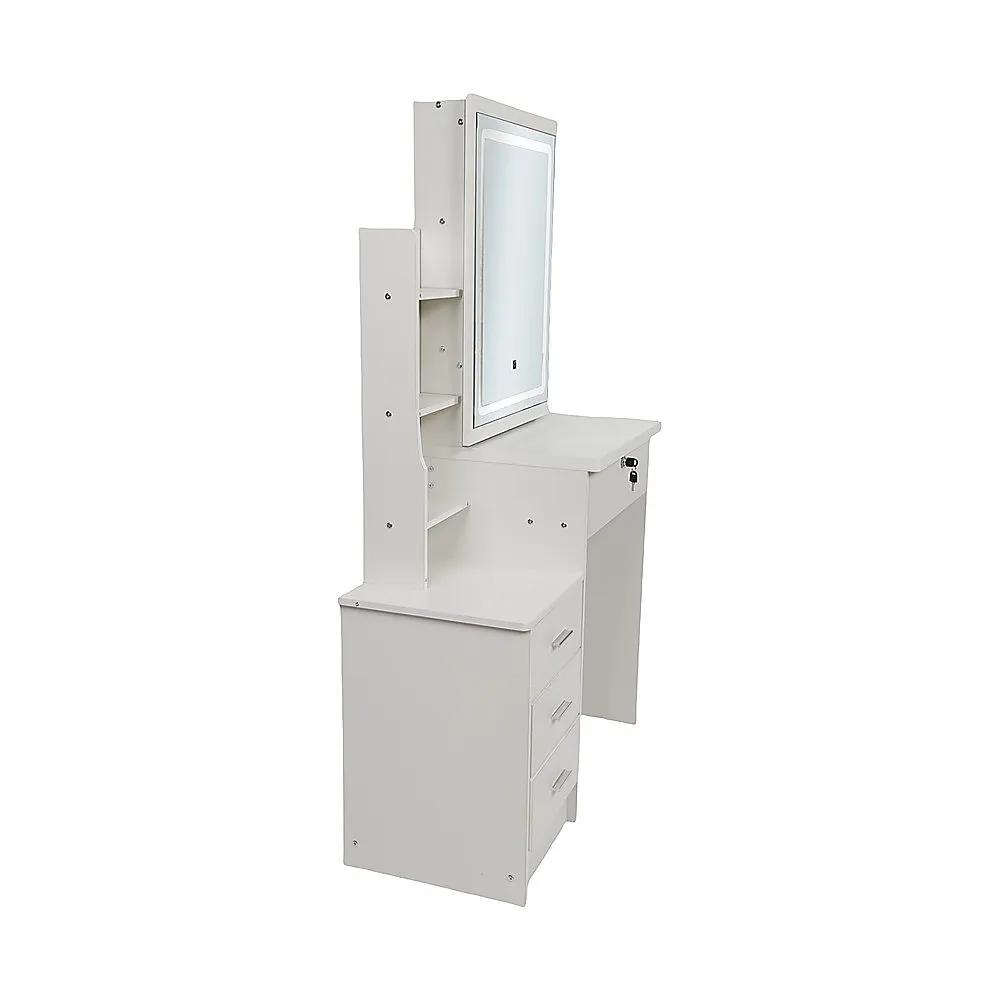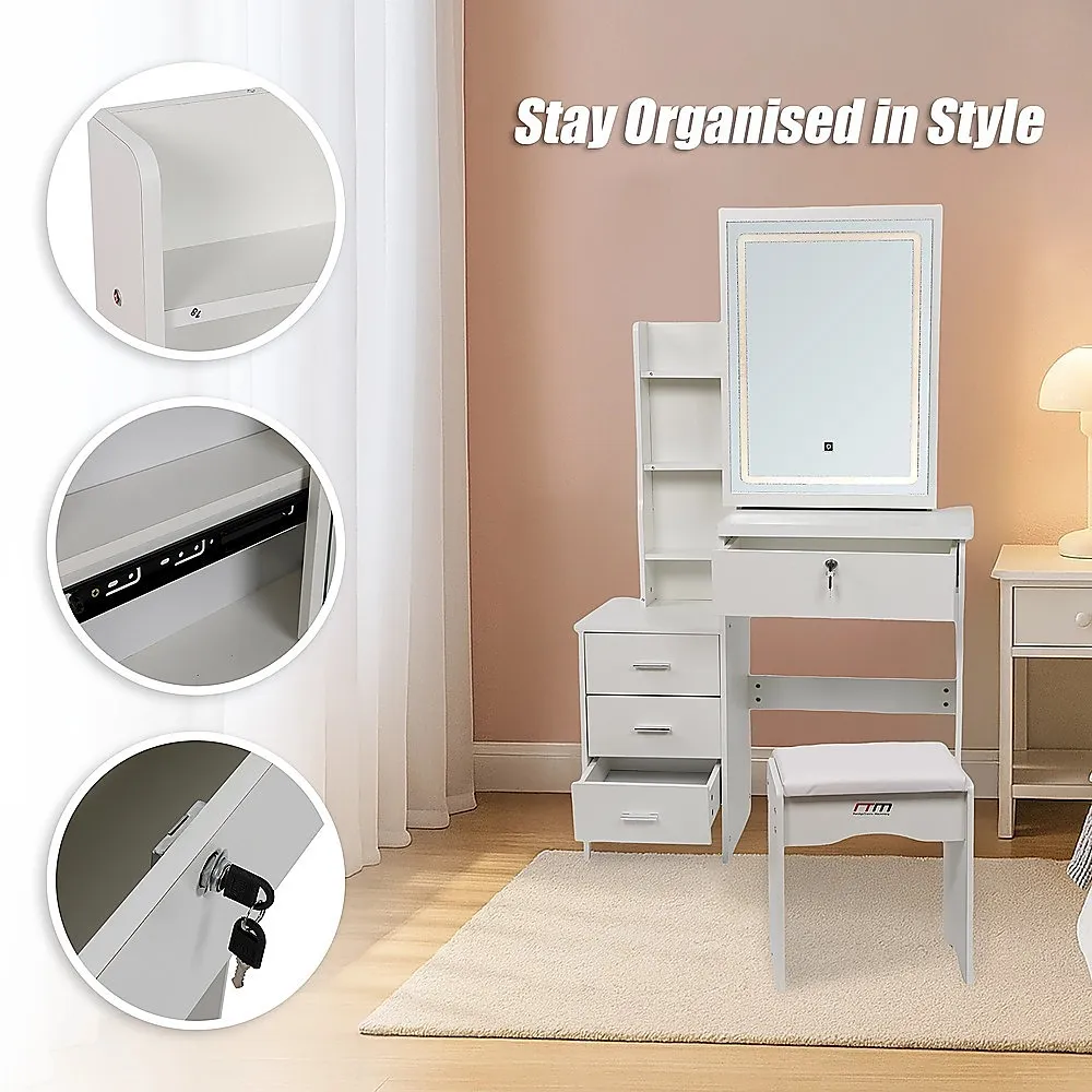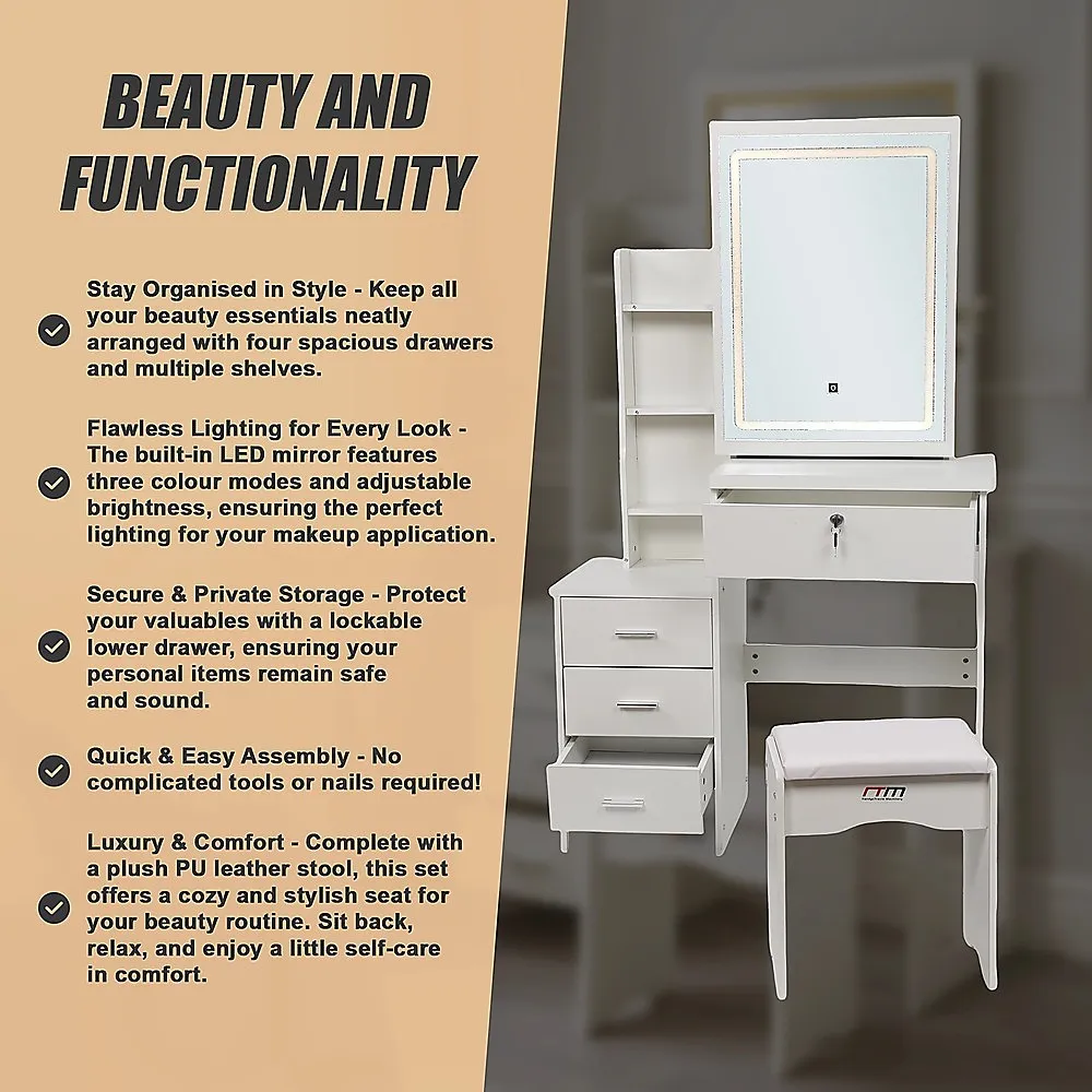 Enhance your bedroom or cozy corner with this elegant vanity set. Featuring a stylish design, built-in LED mirror, and convenient storage drawer, it seamlessly combines beauty and functionalitykeeping your essentials organised and within easy reach.