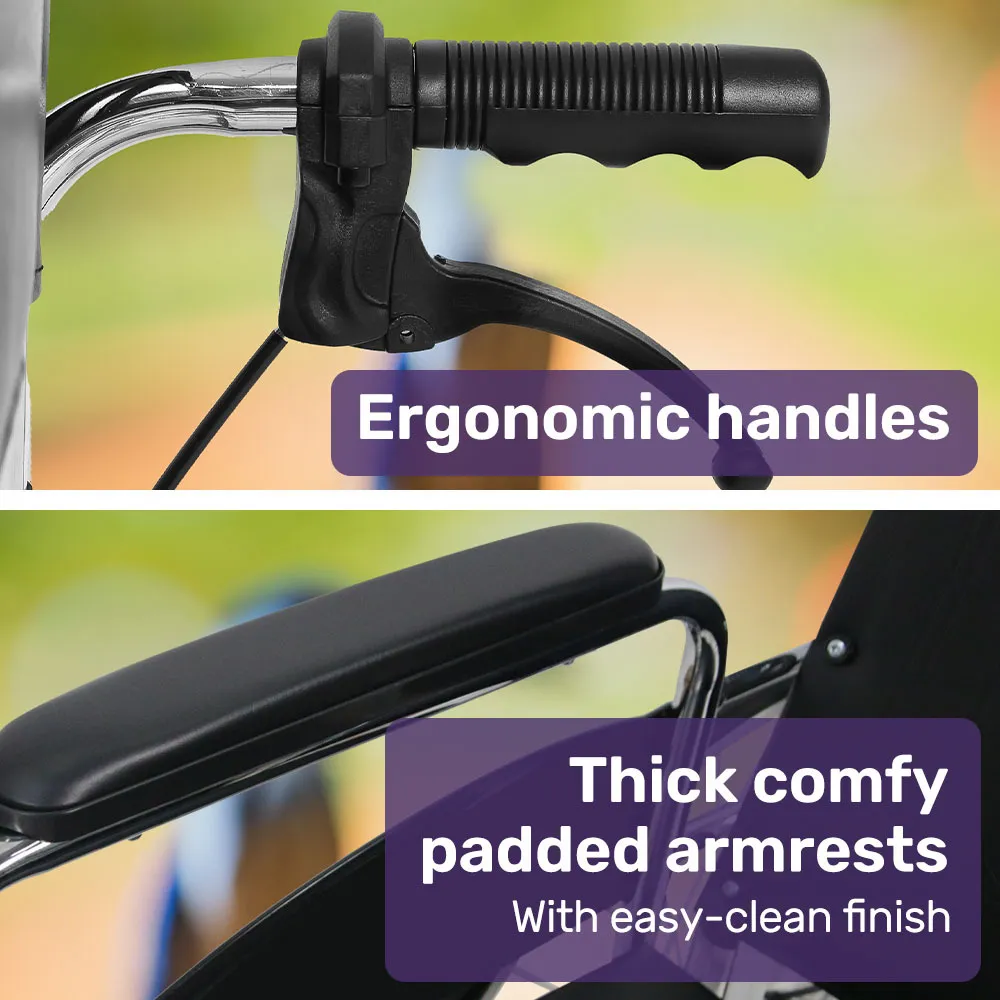 Dual parking brakes can securely lock the wheels in place-a perfect time to pull out some reading material from the backrest pouch! The calf rests can be raised for a relaxing stretch, and may be suitable as a stump support for some amputees. The armrests are removable for convenient table access during meals. The wheelchair can be folded in seconds, and with ergonomic handles it is a relaxing day out for carers as well!
