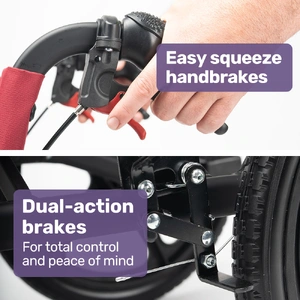 Swing up footrests ensure the safest access on and off the wheel chair. The attendant will appreciate the ergonomic handles and the dual action brakes that not only allow for safe and easy regulating of speed when descending hills, but can also park the wheelchair - ideal for situations like waiting on train platforms. An adjustable seat belt offers additional peace of mind.