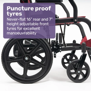 The puncture-proof tyres never require air refills, and the large 16 inch rear wheels are larger than most transit wheelchairs and glide much more smoothly over various surfaces.