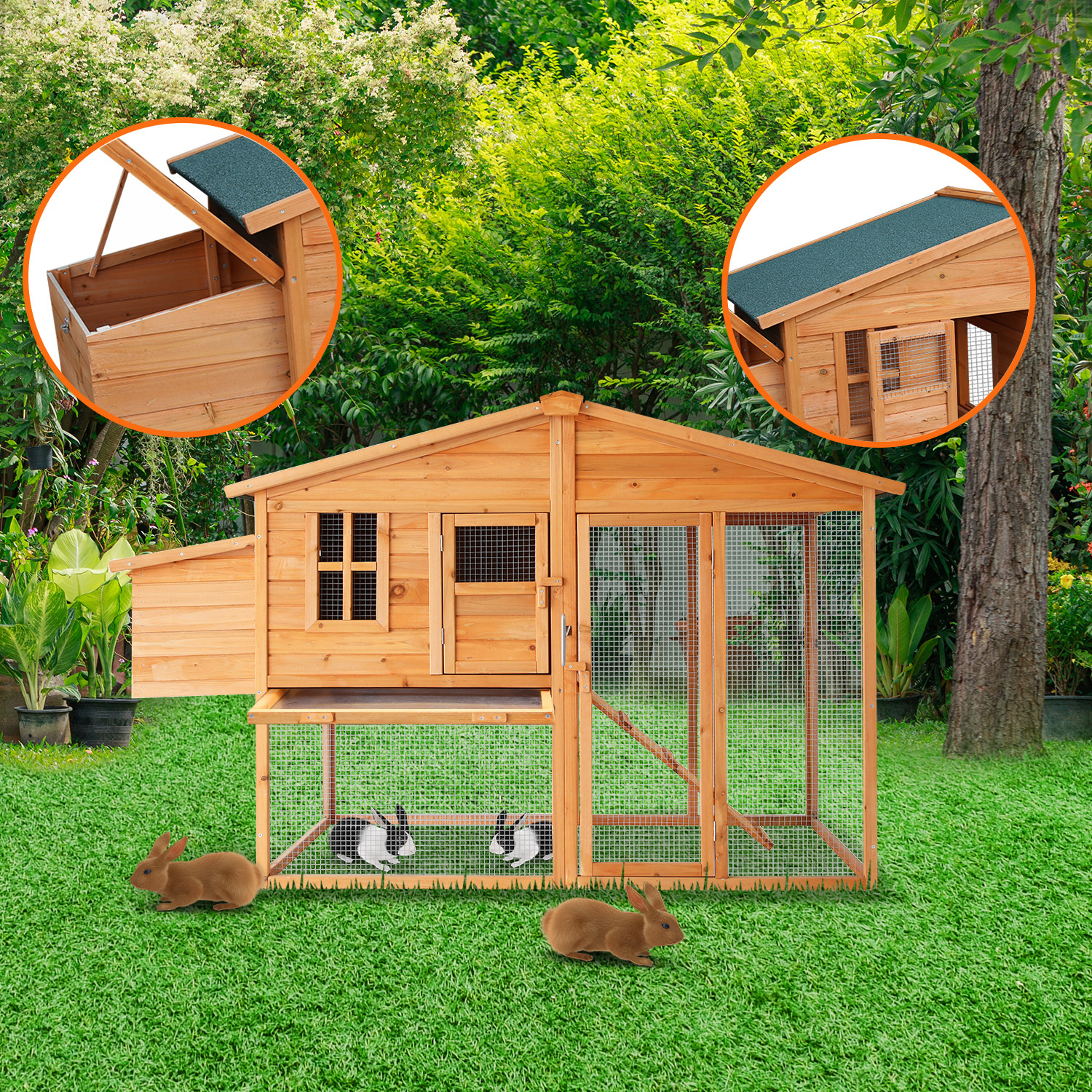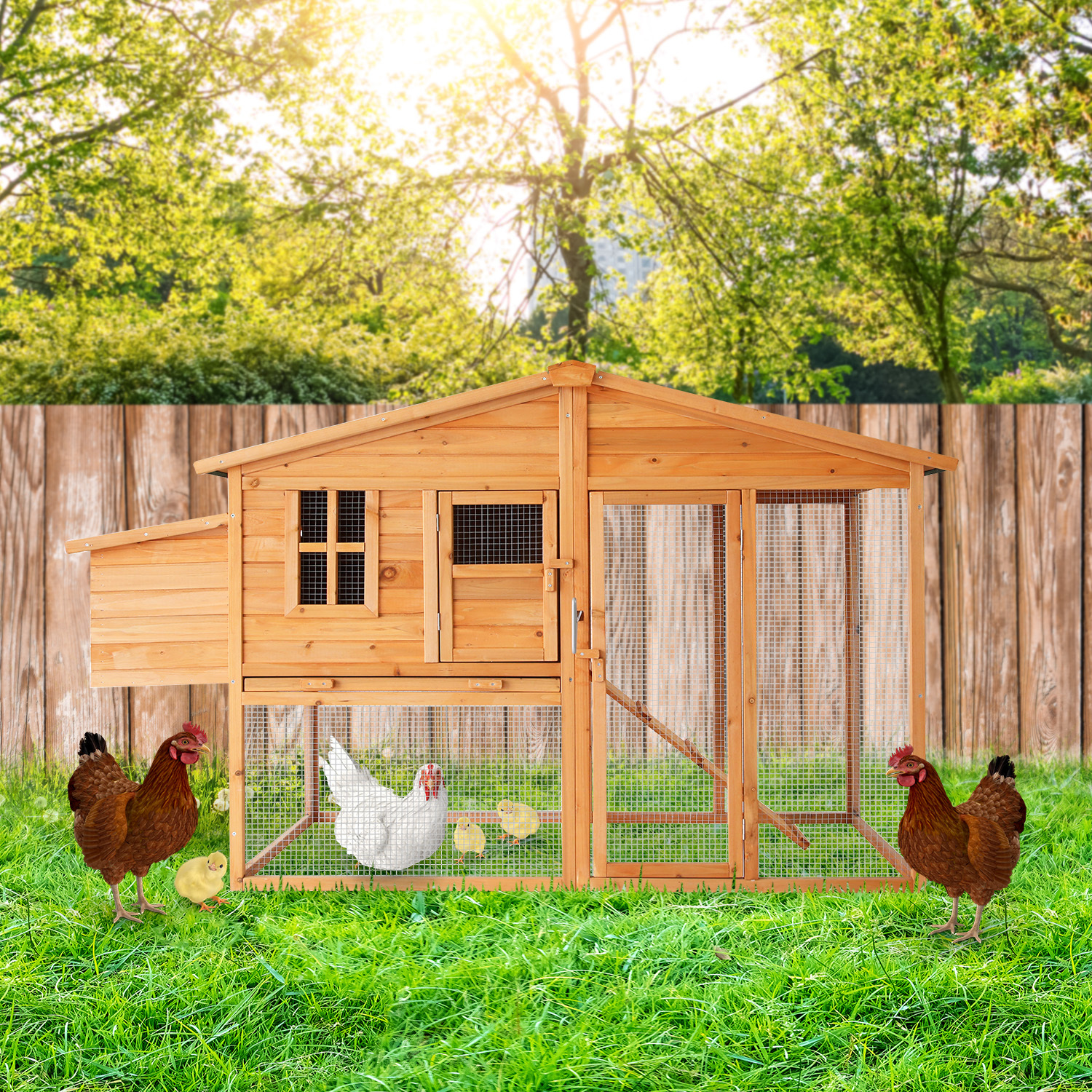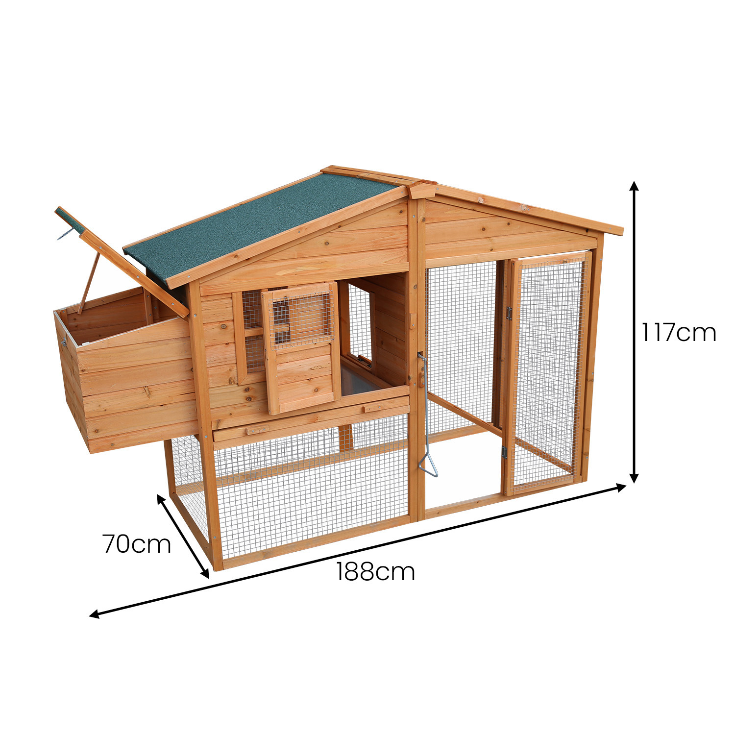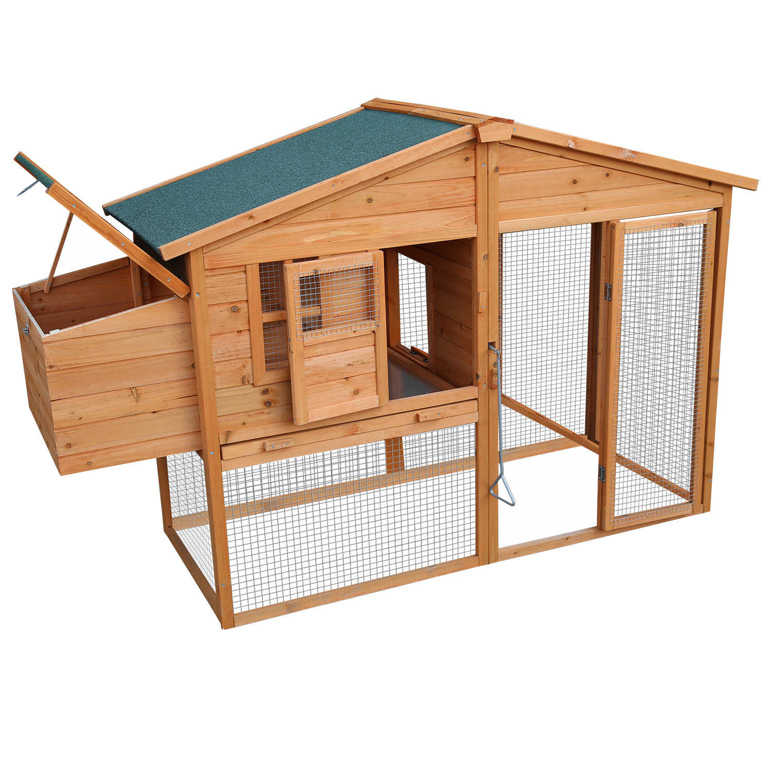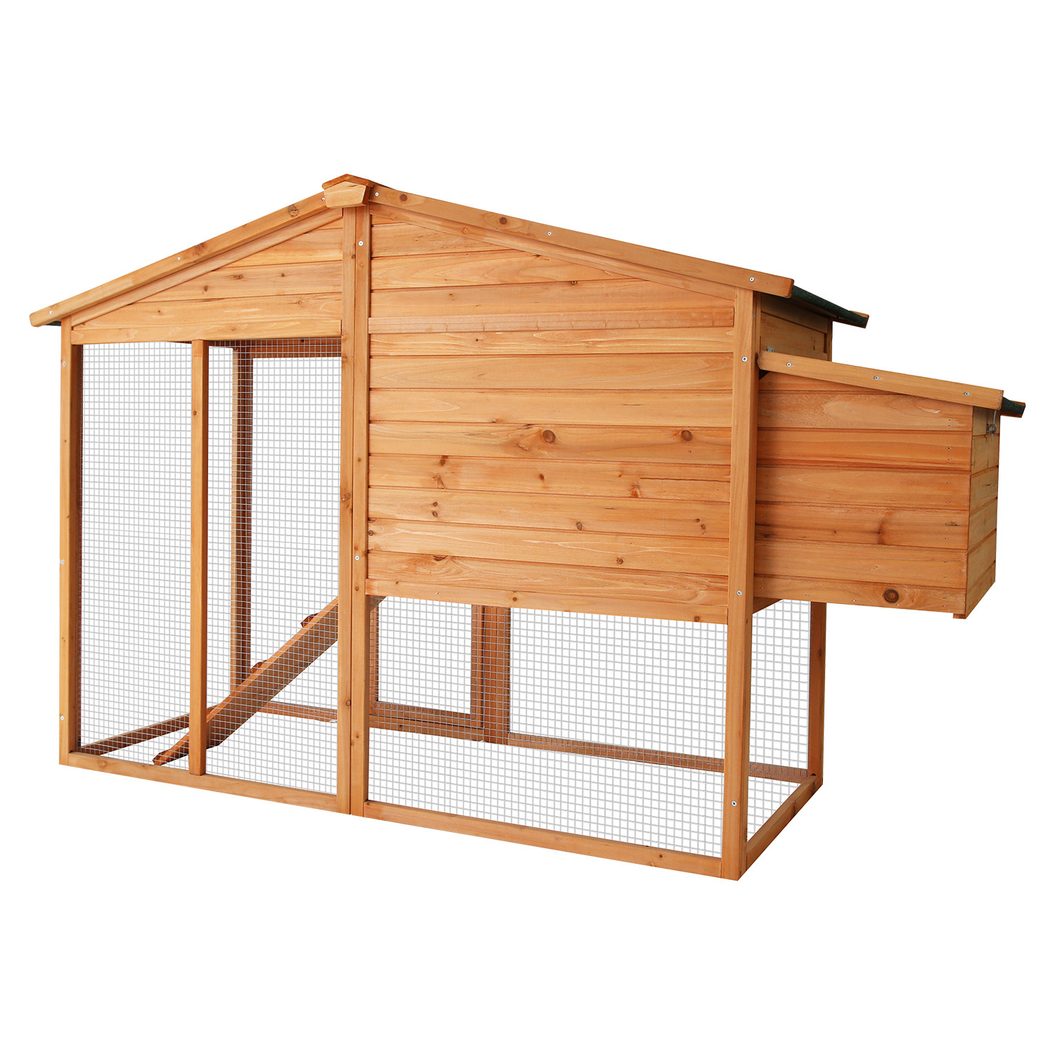 The smart design includes an asphalt roof, offering reliable protection against rain and harsh sunlight. Cleaning is a breeze thanks to the convenient zinc tray, easily removable for hassle-free maintenance. Your pets will love the ramp access inside, allowing them to move in and out effortlessly. Plus, we've added a built-in nesting box, providing a secure and cosy spot for your hens to lay their eggs comfortably.