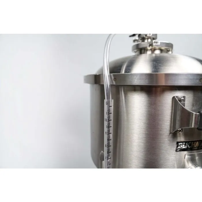 Many homebrewing conicals include an etched internal level gauge. To actually use it, however, you'll need to keep the lid off of your fermenter exposing the wort to potential contamination. The G4 optional external level gauge is a design borrowed from Blichmann's line of Pro conicals. Much easier to read, and you never have to open the unit to view it.