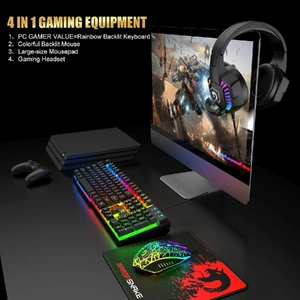 4in1 Wired Gaming Keyboard Mouse with Mechanical Feel RGB Backlight Full Anti-ghosting Keys 3D Stereo Gaming Headset Adjustable Mic 2400DPI Mice Large Mousepad or PC Mac Gamer Office Typist