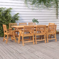 Relax and enjoy a lovely afternoon tea and meals with your family and friends with this classic wooden garden dining set! Solid acacia wood: The dining set is made of solid acacia wood. Solid acacia wood is a beautiful natural material. Acacia wood is a tropical hardwood, which is dense, sturdy, and durable.Comfortable experience: The curved back and armrests of the dining chair ensure optimum comfort and relaxation.Sturdy tabletop: The dining table features a tabletop with a slatted design, making it an excellent spot for dining and placing decorative items such as vases and potted plants.Elegant design: The curved legs of the garden dining chairs add to its elegant design.Easy-to-clean surface: The oil-finished surface makes the patio dining set easy to clean with a damp cloth. Note:To make sure your outdoor furniture stays beautiful, we recommend protecting it with a waterproof cover.