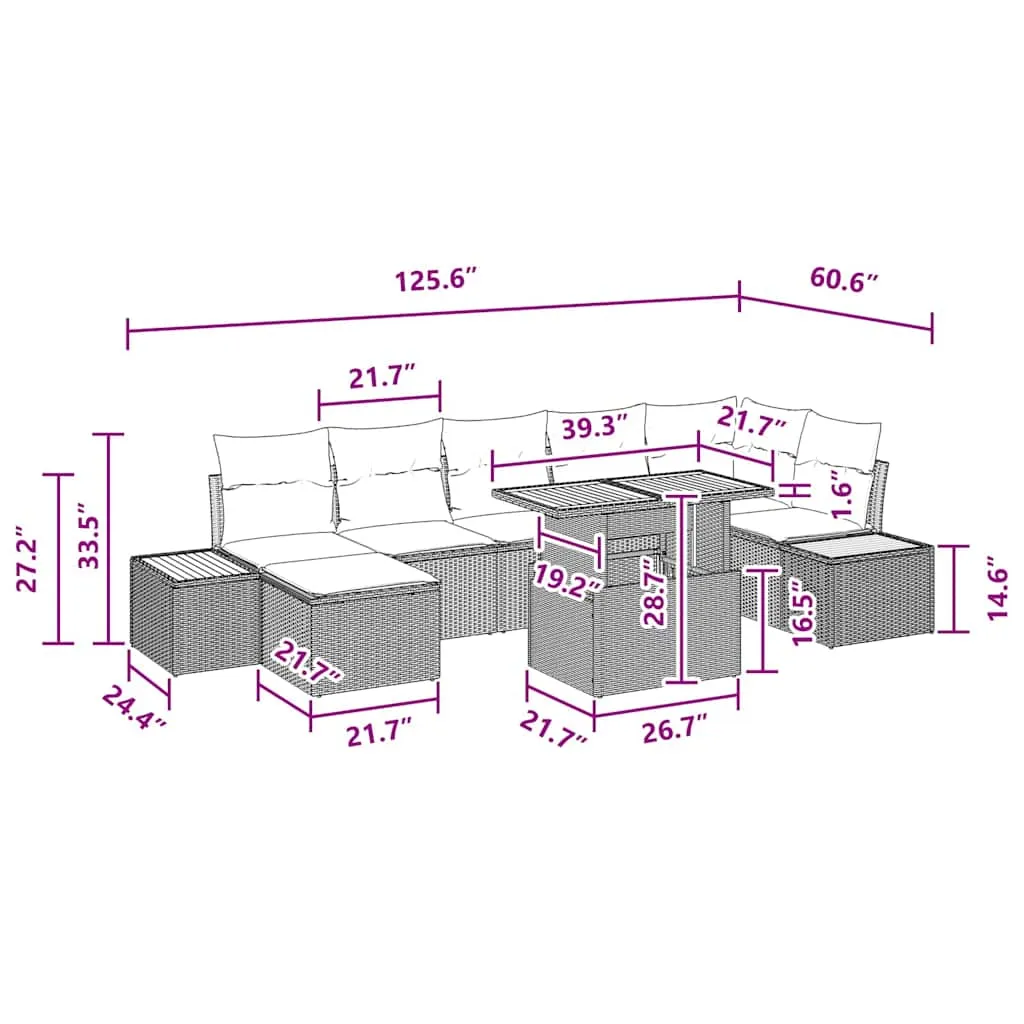 This Contemporary Garden Dining Set offers a unique blend of style and function, perfect for outdoor gatherings. The sleek poly rattan design, paired with solid acacia wood, creates a chic and durable centerpiece for garden or terrace dining. Its robust construction offers a reliable option for weekend lunches, relaxed Sunday dinners, or spontaneous get-togethers, cultivating a warm setting for memories under the open sky. The matte finish gives off a sophisticated yet inviting vibe, making this dining set a swanky addition to any outdoor space. Modular Versatility This garden dining set is designed with a modular structure, allowing homeowners to reconfigure seating according to group size or space layout. Transform your garden into a dynamic social hub with endless configuration possibilities. Each module fits seamlessly together, ensuring a unified, stylish presence amidst flexible functionality. Comprehensive UV Protection Enjoy prolonged exposure to the sun without the worry of fading, thanks to the UV-resistant materials used throughout the set. This feature not only preserves color vibrancy but also ensures long-lasting durability. Whether it's a sun-drenched brunch or vibrant evening soirée, this set stands ready. Convenient Zipper Closure The seat cushions include an easy-access zipper closure, facilitating quick removal for washing or seasonal storage. Keep the cushions fresh and ready to use with minimal effort—perfect for a busy lifestyle. Innovative Storage Solutions Each seating component doubles as a storage unit, offering space-saving functionality. Store garden essentials or party décor without compromising on seating capacity, and keep your area neat and tidy. Thoughtful Care Guidelines When not in use, cover the set to ensure prolonged life and aesthetics. This simple step shields the dining set from harsh weather conditions, keeping it looking pristine over time. Avoid the need for costly repairs or replacements with these practical care tips.