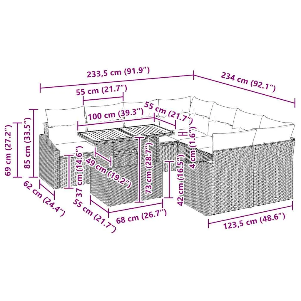 Take your outdoor style up a notch with the Poly Rattan Garden Dining Set, a beautiful combo of style and practicality for your garden or terrace. This modern dining set sports clean lines and minimal fuss, creating a sleek look that matches the simplicity of today’s design. Well-crafted, it brings a touch of class and makes sure everyone’s comfy during gatherings. Whether it’s for chilled brunches or lively garden parties, this set creates a welcoming vibe for all your social events. Premium Materials: Made from tough powder-coated steel, poly rattan, and solid Acacia wood, this dining set promises durability and is resistant to UV rays and weather. The high-quality materials blend strength and elegance, making it ideal for outdoor fun. Storage Functionality: Thoughtfully designed with handy storage spots in the arm, corner, and center seats to help keep cushions and other essentials organized. This neat feature means you can keep your outdoor area tidy. Modular Versatility: The dining set's modular parts let you mix and match configurations. Easily change the layout to fit any situation, whether it’s a cozy dinner or a big gathering—adding flexibility to your experience. Square Armrests: Featuring straight-edged arms made from poly rattan for practical support and style. This design detail boosts overall comfort and looks great, encouraging relaxation and socializing. Care Guidance: Look after your set with a waterproof cover and just give the Acacia wood surfaces a wipe with a damp cloth to keep them looking fab. These easy steps will keep your dining set shining and ready to go.