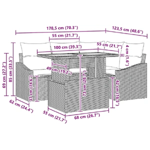 - 2 x Arm sofa with storage function, 1 x Corner seat with storage function, 1 x Centre seat with storage function, 1 x Garden table
