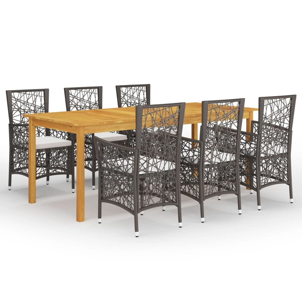 Create a compelling and cohesive aesthetic in your outdoor space with this garden dining set! The dinner table is made of solid acacia wood with an oil finish, which makes it stable, durable and easy to maintain. Featuring a powder-coated steel frame covered with weather-resistant PE rattan, these dining chairs are sturdy and easy to clean. Each seat comes with a removable thickly padded cushion for adding comfort in your lounging time. Important note: We recommend covering the dining set during rain, snow and frost for its best service to last.