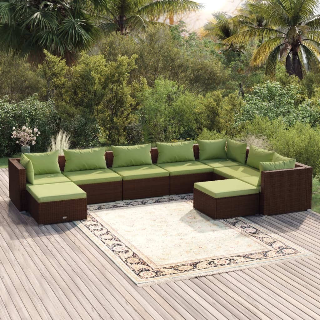 Relax and enjoy outdoor space with your family and friends on our classic poly rattan garden lounge set with cushions! Premium material: The patio lounge set is designed with weather-resistant and water-resistant PE rattan, making it easy to clean, hard-wearing and suitable for daily outdoor use.Sturdy frame: This outdoor lounge set is made with a sturdy powder-coated steel frame and plastic chrome feet that provides durability.Comfortable cushions: The thickly padded and removable cushions are made of fabric, soft to touch and bring you extra comfort.Modular design: This rattan lounge set is modular and lightweight. It is also flexible to place the set in any arrangement or combine it with other modular segments to meet your needs.Note:In order to extend the life of your outdoor furniture, we recommend you clean it regularly and do not leave it outdoors without protection unnecessarily.Clean: Use a mild soap solution.Storing: If possible, store in a cool, dry place indoors. If the product is stored outdoors, protect it with a waterproof cover. Wipe and dry the excess water or snow from flat surfaces after a rain or snowfall. Allow sufficient air circulation to avoid moisture-related damage.