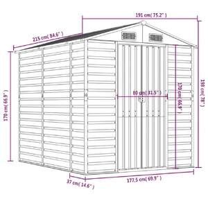 Expand your outdoor storage possibilities and protect your tools with this multifunctional garden shed. Robust material: The garden tool shed is made of galvanised steel, which prevents rusting and endures long-time use. Steel is an exceptionally hard and strong material. It offers sturdiness and stability. Galvanisation provides better protection against corrosion and is useful for products that'll be used outdoors as well as in harsh environments.Ample storage space: This metal shed provides ample space to store your firewood, garden tools, furniture, equipment, and more.Convenient handles: The storage shed features handles on the door for easy entry.Good ventilation: The outdoor shed is equipped with 4 air vents, providing ventilation to reduce the accumulation of moisture and odour in the house.Sloping design: The sloping roof ensures unimpeded drainage of water.
