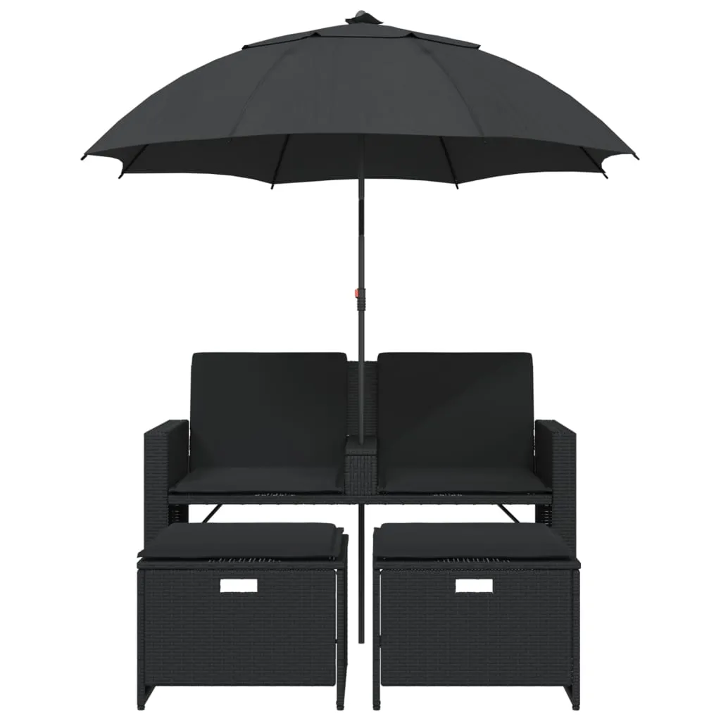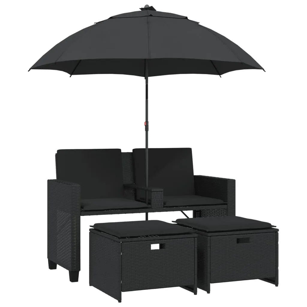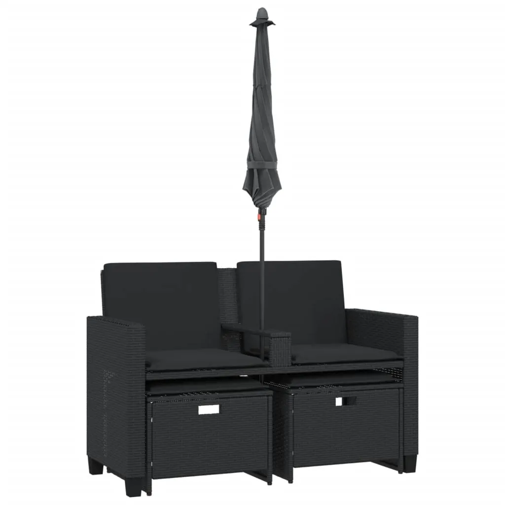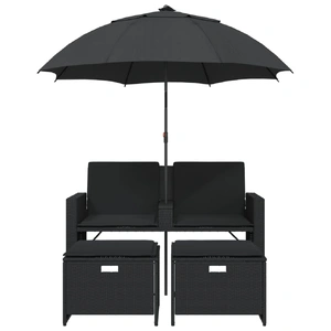 This garden sofa with parasol and footstools is the perfect addition to your backyard, terrace, or patio, providing a comfortable and inviting space for chatting with family and friends or simply relaxing and enjoying the outdoors. Durable material: PE rattan, also known as poly rattan, is a strong, low-maintenance synthetic material that looks like natural rattan. It's lightweight, easy to clean, and commonly used for outdoor furniture due to its durability and weather-resistant properties.Practical parasol: The garden sofa features a parasol with a tilt mechanism, allowing you to easily adjust the canopy for optimal shade and protection from the sun.Removable and washable cover: These cushions feature removable covers for easy washing and maintenance.Compact storage: These footstools can be neatly tucked underneath the seats, allowing for space-saving storage.Robust and stable frame: The powder-coated steel frame ensures that the garden furniture is strong and stable for daily outdoor use. Good to know:To make sure your outdoor furniture stays beautiful, we recommend protecting it with a waterproof cover.