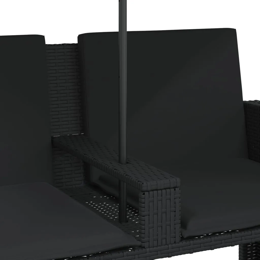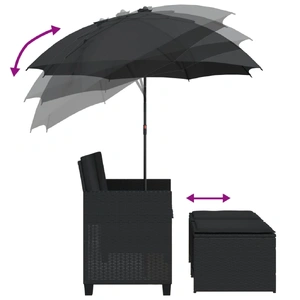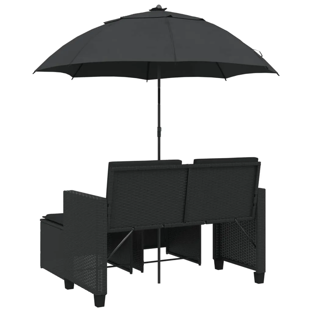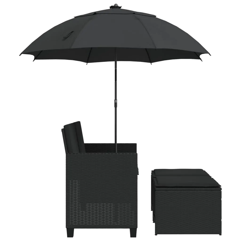 This garden sofa with parasol and footstools is the perfect addition to your backyard, terrace, or patio, providing a comfortable and inviting space for chatting with family and friends or simply relaxing and enjoying the outdoors. Durable material: PE rattan, also known as poly rattan, is a strong, low-maintenance synthetic material that looks like natural rattan. It's lightweight, easy to clean, and commonly used for outdoor furniture due to its durability and weather-resistant properties.Practical parasol: The garden sofa features a parasol with a tilt mechanism, allowing you to easily adjust the canopy for optimal shade and protection from the sun.Removable and washable cover: These cushions feature removable covers for easy washing and maintenance.Compact storage: These footstools can be neatly tucked underneath the seats, allowing for space-saving storage.Robust and stable frame: The powder-coated steel frame ensures that the garden furniture is strong and stable for daily outdoor use. Good to know:To make sure your outdoor furniture stays beautiful, we recommend protecting it with a waterproof cover.