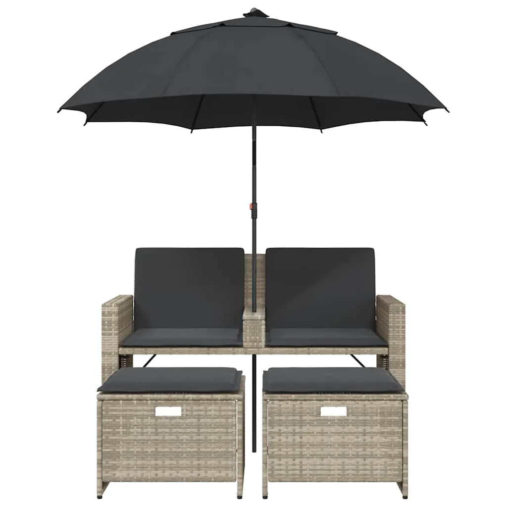 This garden sofa with parasol and footstools is the perfect addition to your backyard, terrace, or patio, providing a comfortable and inviting space for chatting with family and friends or simply relaxing and enjoying the outdoors. Durable material: PE rattan, also known as poly rattan, is a strong, low-maintenance synthetic material that looks like natural rattan. It's lightweight, easy to clean, and commonly used for outdoor furniture due to its durability and weather-resistant properties.Practical parasol: The garden sofa features a parasol with a tilt mechanism, allowing you to easily adjust the canopy for optimal shade and protection from the sun.Removable and washable cover: These cushions feature removable covers for easy washing and maintenance.Compact storage: These footstools can be neatly tucked underneath the seats, allowing for space-saving storage.Robust and stable frame: The powder-coated steel frame ensures that the garden furniture is strong and stable for daily outdoor use. Good to know:To make sure your outdoor furniture stays beautiful, we recommend protecting it with a waterproof cover.