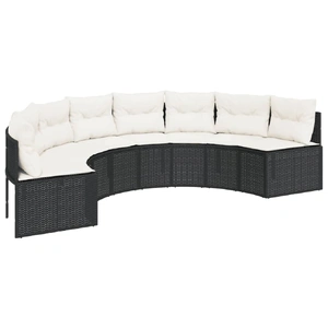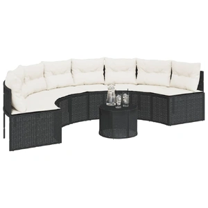 This half-round-shaped garden sofa is the perfect addition to your garden, terrace, or patio, providing a comfortable and inviting space for chatting with family and friends or simply relaxing and enjoying the outdoors. Durable material: PE rattan, also known as poly rattan, is a strong, low-maintenance synthetic material that looks like natural rattan. It's lightweight, easy to clean, and commonly used for outdoor furniture due to its durability and weather-resistant properties.Comfortable seat experience: This outdoor furniture, complete with thickly padded cushions, offers a comfortable seating experience.Removable and washable cover: These seat cushions feature removable covers for easy washing and maintenance.Glass tabletop: The outdoor table's top is made from strong and durable tempered glass, making it easy to clean with a damp cloth and adding a touch of elegance to your outdoor space.Robust and stable frame: The powder-coated steel frame ensures that the garden furniture is strong and stable for daily outdoor use. Good to know:To make sure your outdoor furniture stays beautiful, we recommend protecting it with a waterproof cover.