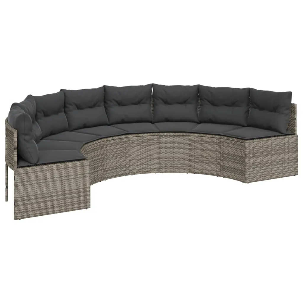 This half-round-shaped garden sofa is the perfect addition to your garden, terrace, or patio, providing a comfortable and inviting space for chatting with family and friends or simply relaxing and enjoying the outdoors. Durable material: PE rattan, also known as poly rattan, is a strong, low-maintenance synthetic material that looks like natural rattan. It's lightweight, easy to clean, and commonly used for outdoor furniture due to its durability and weather-resistant properties.Comfortable seat experience: This outdoor furniture, complete with thickly padded cushions, offers a comfortable seating experience.Removable and washable cover: These seat cushions feature removable covers for easy washing and maintenance.Glass tabletop: The outdoor table's top is made from strong and durable tempered glass, making it easy to clean with a damp cloth and adding a touch of elegance to your outdoor space.Robust and stable frame: The powder-coated steel frame ensures that the garden furniture is strong and stable for daily outdoor use. Good to know:To make sure your outdoor furniture stays beautiful, we recommend protecting it with a waterproof cover.
