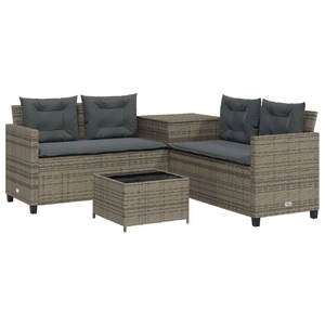 This L-shaped garden sofa is the perfect addition to your garden, terrace, or patio, providing a comfortable and inviting space for chatting with family and friends or simply relaxing and enjoying the outdoors. Durable material: PE rattan, also known as poly rattan, is a strong, low-maintenance synthetic material that looks like natural rattan. It's lightweight, easy to clean, and commonly used for outdoor furniture due to its durability and weather-resistant properties.Storage function with water-resistant bag: The garden side table features storage space underneath, complete with a water-resistant bag for storing cushions, toys, and other items. The inner bags have a top cover and can be securely fastened to the seats with hook-and-loop fasteners for added stability.Comfortable seat experience: This outdoor furniture, complete with thickly padded cushions, offers a comfortable seating experience.Removable and washable cover: These seat cushions feature removable covers for easy washing and maintenance.Glass tabletop: The outdoor table's top is made from strong and durable tempered glass, making it easy to clean with a damp cloth and adding a touch of elegance to your outdoor space. Good to know:To make sure your outdoor furniture stays beautiful, we recommend protecting it with a waterproof cover.