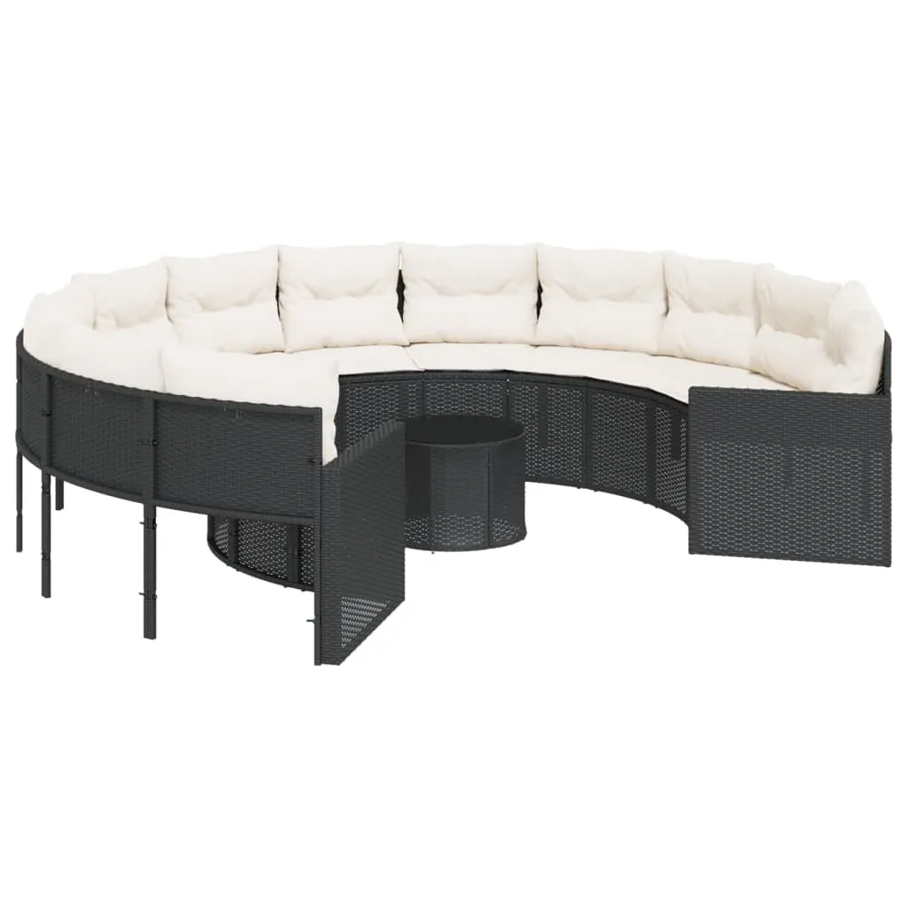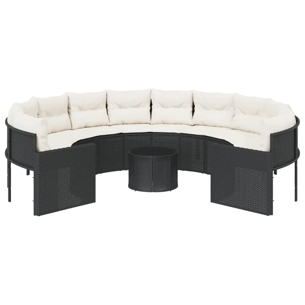 This round-shaped garden sofa is the perfect addition to your garden, terrace, or patio, providing a comfortable and inviting space for chatting with family and friends or simply relaxing and enjoying the outdoors. Durable material: PE rattan, also known as poly rattan, is a strong, low-maintenance synthetic material that looks like natural rattan. It's lightweight, easy to clean, and commonly used for outdoor furniture due to its durability and weather-resistant properties.Comfortable seat experience: This outdoor furniture, complete with thickly padded cushions, offers a comfortable seating experience.Removable and washable cover: These seat cushions feature removable covers for easy washing and maintenance.Glass tabletop: The outdoor table's top is made from strong and durable tempered glass, making it easy to clean with a damp cloth and adding a touch of elegance to your outdoor space.Robust and stable frame: The powder-coated steel frame ensures that the garden furniture is strong and stable for daily outdoor use. Good to know:To make sure your outdoor furniture stays beautiful, we recommend protecting it with a waterproof cover.