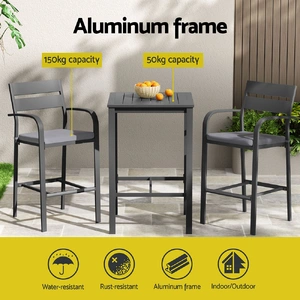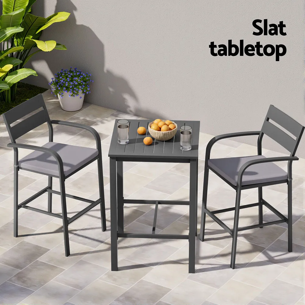 Elevate your outdoor living with Gardeon's stylish 3-piece aluminum bar stool set, perfect for creating an inviting bar area in your backyard, business, or holiday home. These weather-resistant stools feature a finely slatted backrest, curved armrests, and a built-in footrest for optimal comfort, while secured foot pads ensure stability on various surfaces. The removable, extra-thick cushions provide plush seating, making these stools ideal for outdoor enjoyment.