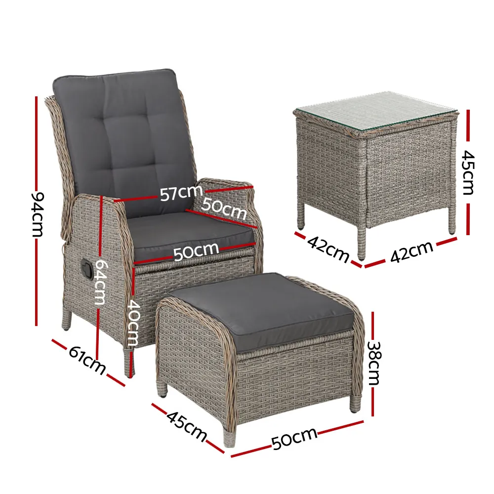Now you can really sit back and chill in the outdoors with the Gardeon Wicker Recliner Set. Comprising two oversized recliners, two matching ottomans and a handy side table, the outdoor ensemble is everything you need for relaxation in elegant wicker style. The set is made of UV-resistant and weather-resistant PE wicker so that you never have to worry about rust, corrosion or weathering issues. The heavy-duty powder-coated steel frame is sturdy and hardy and will stand up to robust use easily. More importantly, the recliner has an adjustable backrest to suit your angle of rest. Better still, the seat cushion is made of high-density foam for ultra-comfort while the zipped cover is weather-resistant, removable and washable. Not least, the useful ottoman is just perfect for putting your feet up as you sip your latte or Bordeaux placed next to you on the tempered glass top side table. Yes, it is indeed paradise under the sun, moon and stars. Have it outdoors or indoors, the wicker recliner set is equally at home with its exquisite design and unique presence for any home décor enthusiast.