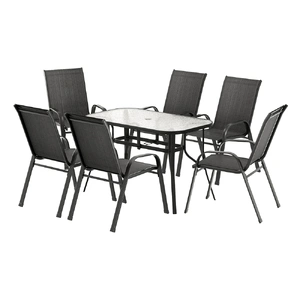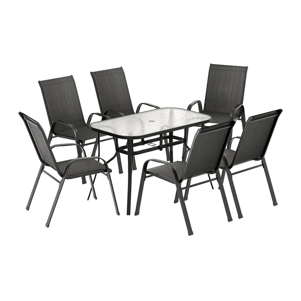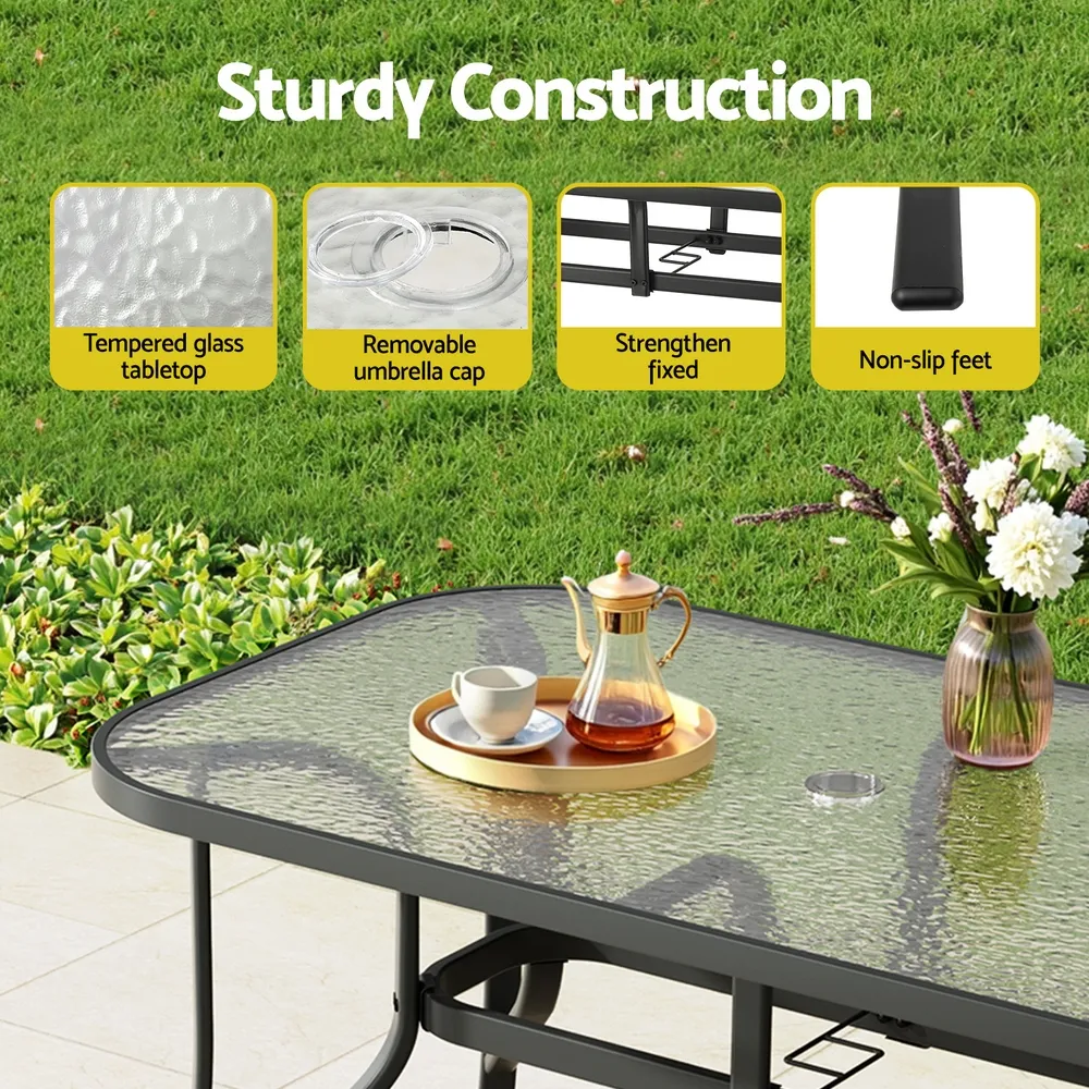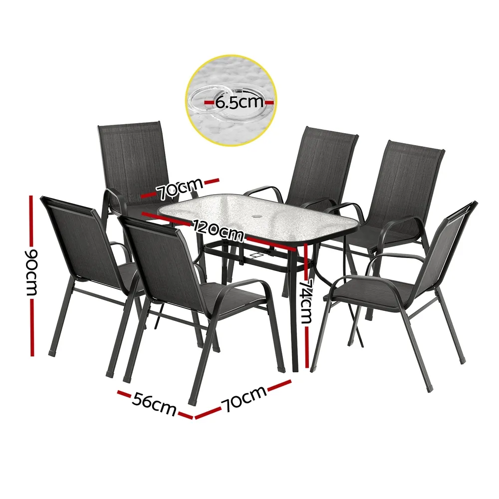 Elevate your outdoor living with the Gardeon 7 Piece Mesh Dining Set—perfect for sunny gatherings in fresh air! The rust-proof powder-coated steel frame ensures lasting durability, while the all-weather synthetic fabric resists sun, rain, and stains, keeping colors vibrant for years. The spacious tempered glass table features a convenient parasol hole for shade, and the stackable chairs maximize storage space. Floor protectors safeguard your surfaces while providing stability on uneven ground. With its sleek, versatile design, this set transitions seamlessly from patio to indoor dining. Low-maintenance and built for comfort, the Gardeon dining set is ideal for relaxing meals with family and friends under the open sky!