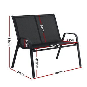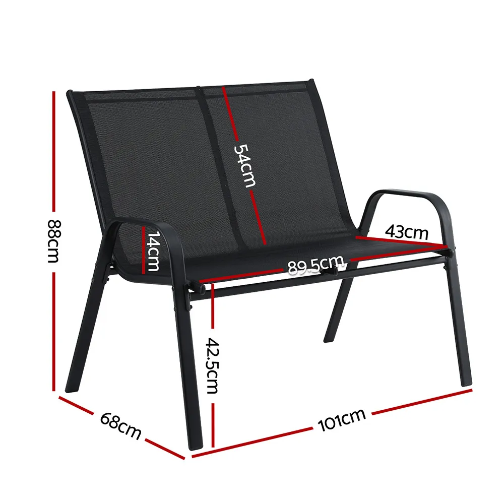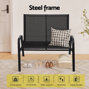 The Gardeon 2-Seat Outdoor Bench combines durability and comfort for gardens, patios, or indoor spaces. Its steel frame with rust-resistant powder coating withstands harsh weather, while the textilene fabric offers easy cleaning and UV protection. Supports up to 200kg with non-slip feet for stability. Requires no tools for assembly - simply unfold and enjoy. Perfect for hosting or relaxing solo!