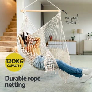 Experience the ultimate relaxation with the Gardeon Hammock Chair, crafted from a durable and soft-touch cotton blend fabric that provides exceptional comfort. The smooth finishing natural timber rail adds a touch of elegance and ensures sturdy support. Lightweight and easy to carry, this hammock chair is perfect for both indoor and outdoor settings, requiring no assembly for effortless setup