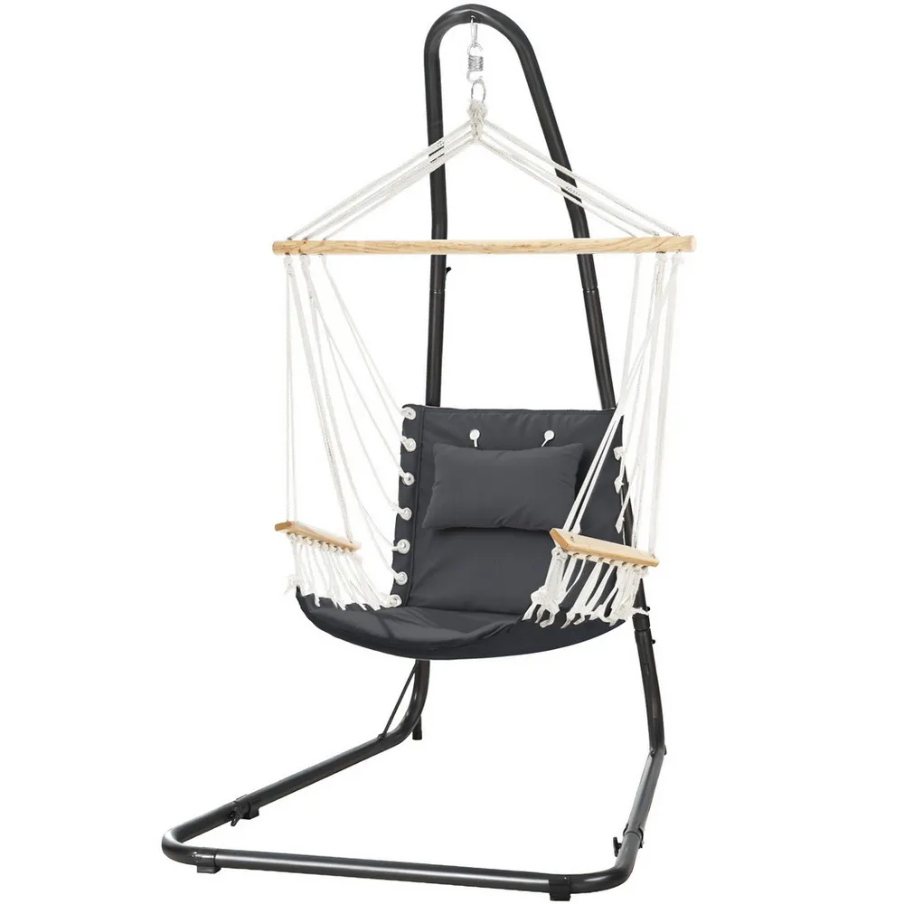 Nothing can make you happier and satisfied than lazily resting in Gardeon hanging hammock chair set! Gardeon hanging hammock chair set is a piece of excellent furniture perfect for outdoor and indoor use. It is made from quality polyester cotton blend fabric and has a solid timber rail for strength and durability, and the powder-coated steel frame is designed to be weather and rust-resistant. This A-Frame model remains customers who love relaxing in their hammock chairs indoors or out. Plus, it's easy to install with one single attachment point for absolute safety. Stand can adjust 40cm height range with 5 holes . This versatile furniture set is suitable to be placed by the poolside, in the backyard, or in any corner of your home.