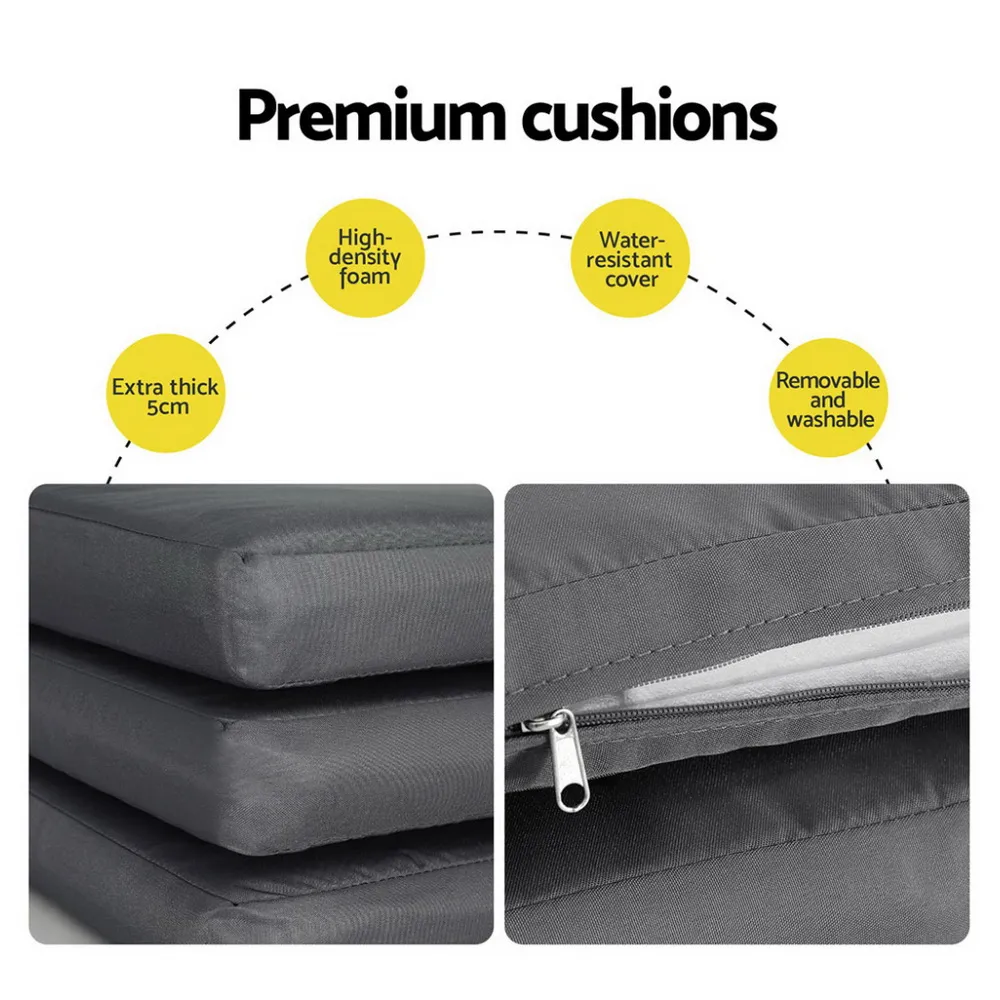 With summer fast approaching, you can once again join the sunshine with the Gardeon 5-piece Outdoor Dining Set. Made from a powder-coated metal frame, the set is designed for outdoor or indoor use in a wide range of weather conditions. The table and chairs are designed to comfortably seat four people across four single chairs, or the table can be extended to fit up to six (extra chairs not included). The stable structure features fixed safety screws, giving each chair a 150kg weight capacity and a table weight capacity of 50kg. The seats are classically designed and completely comfortable with an inclined backrest, comfortable handrails, and 5cm thick foam cushions. The cushions feature removable and washable covers for easy cleaning. The table and chairs feature a slatted surface for easy drainage during wet weather. With easy and hassle-free assembly, the Gardeon 5-piece Outdoor Dining Set is the perfect addition to any backyard, patio or even sitting room.