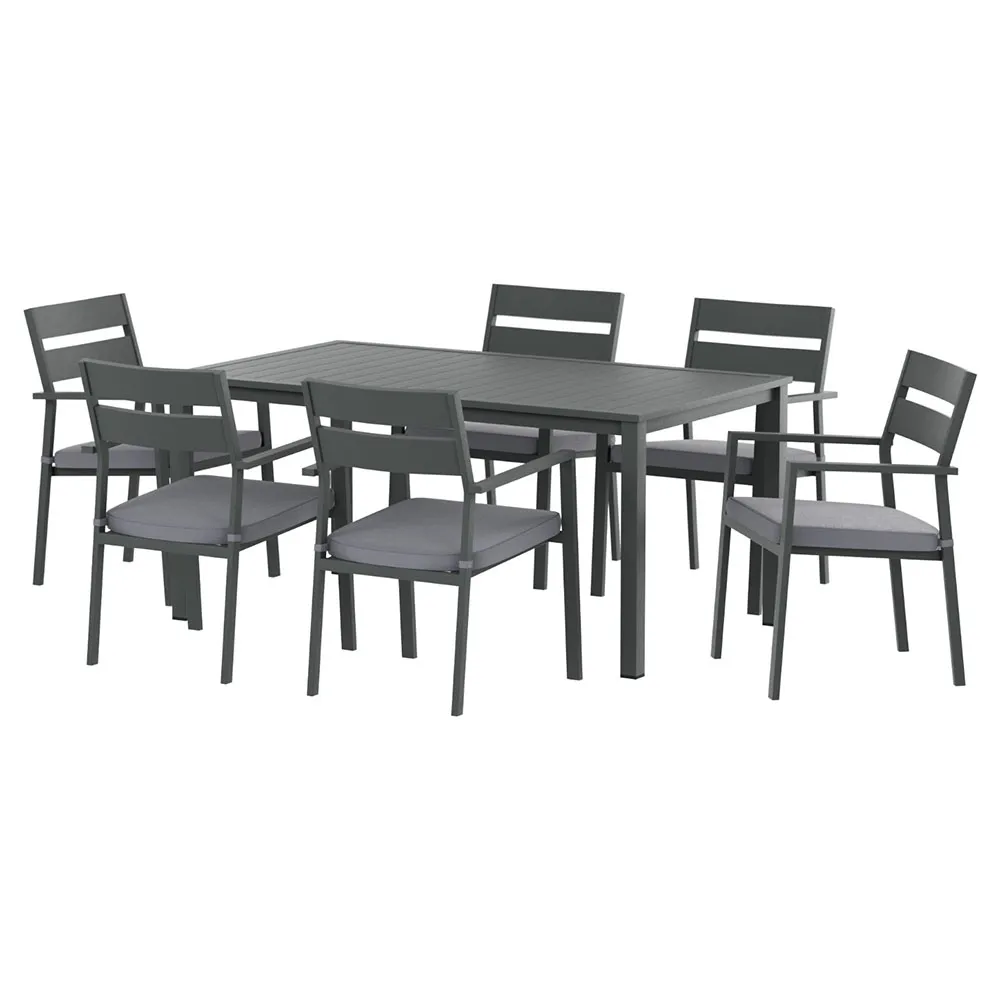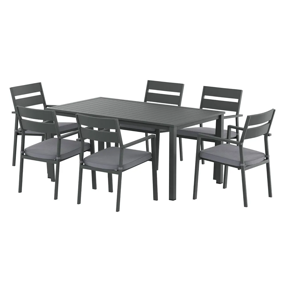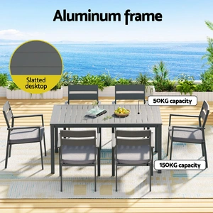 Bring friends and family together with the new 6-seater Outdoor Dining Set from Gardeon. With six stylish dining chairs surrounding a generous dining table, there's room for everyone to enjoy an outdoor dinner or luncheon. Made with a powder-coated aluminium frame and topped with 6cm thick cushions, the set is strong and durable – perfect for withstanding outdoor weather. The cushion covers are UV and water-resistant, and they can be removed for easy cleaning. Remove the cushions entirely to match the season. The smooth surface and slatted design make the table easy to clean and maintain. The classic design is perfect for backyards of all kinds, making it the ideal dining set for all your indoor and outdoor entertainment needs. Make the most of your time outdoors with the Gardeon 6-seater Outdoor Dining Set.