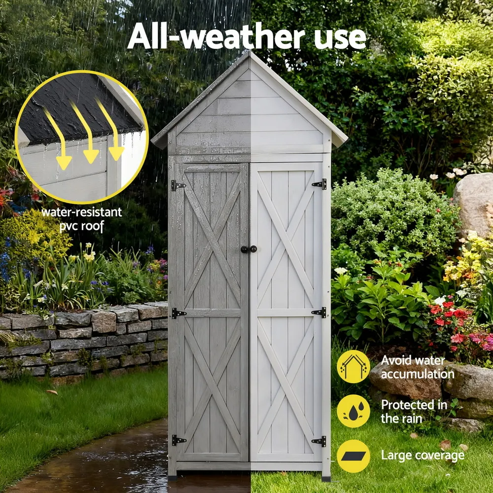 Organize with Gardeon's Spacious Outdoor Storage Cabinet -featuring 3 shelves and ample storage for all your tools & gear. Built to last, this weatherproof outdoor cupboard combines solid fir wood and a durable PVC roof for all-season protection. The 2cm thick wood resists cracks and corrosion, ensuring long-lasting use. Easy assembly with numbered parts, full hardware, and a clear guide. Versatile as a garden cupboard, balcony storage, or outdoor cabinet, all with a sleek wood finish.