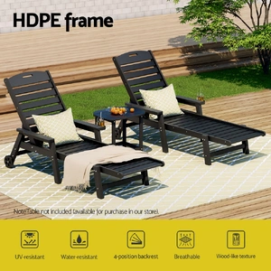 Upgrade your relaxation with the Gardeon 4-position adjustable chaise lounge! Featuring a versatile reclining backrest, this lounge chair adapts perfectly to sunbathing, reading, or napping. Its sturdy frame supports up to 150kg, while the rolling wheels and handles allow for effortless repositioning. Crafted from weatherproof wood-grain HDPE and 304 stainless steel, it resists sun, rain, and wind without fading. The chair includes a convenient cup holder and is designed for quick setup—so you can start enjoying it immediately with minimal effort. Ideal for poolside, patio, or beach relaxation.