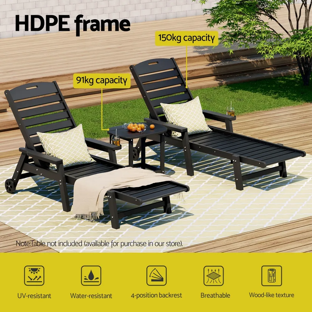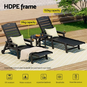 Upgrade your outdoor relaxation with the Gardeon 3-Piece Set! This versatile combo includes two 4-position adjustable chaise lounges and a durable HDPE side table, perfect for poolside, patio, or beach use. The lounges feature reclining backrests for sunbathing, reading, or napping, with 150kg weight capacity, weatherproof HDPE wood-grain construction, and stainless steel frames. Effortlessly move them with rolling wheels and handles. The matching side table is fade-resistant, supports 91kg, and includes water-draining slats and safety-curved edges. Zero maintenance��just wipe clean! Quick assembly lets you enjoy instant comfort. Ideal for stylish, hassle-free outdoor living!