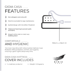 The Gioia Casa Ultra-Soft Cotton Quilted Mattress Cover Protector is designed not only to protect your mattress but also to enhance your sleep experience. Its soft cotton fabric, combined with the elegant quilted design, offers luxurious comfort, while the anti-microbial and hypoallergenic properties ensure a clean and healthy sleep environment. The waterproof backing provides peace of mind by safeguarding your mattress from any spills or stains. Invest in this high-quality mattress protector today and enjoy the perfect blend of comfort, protection, and style every night.