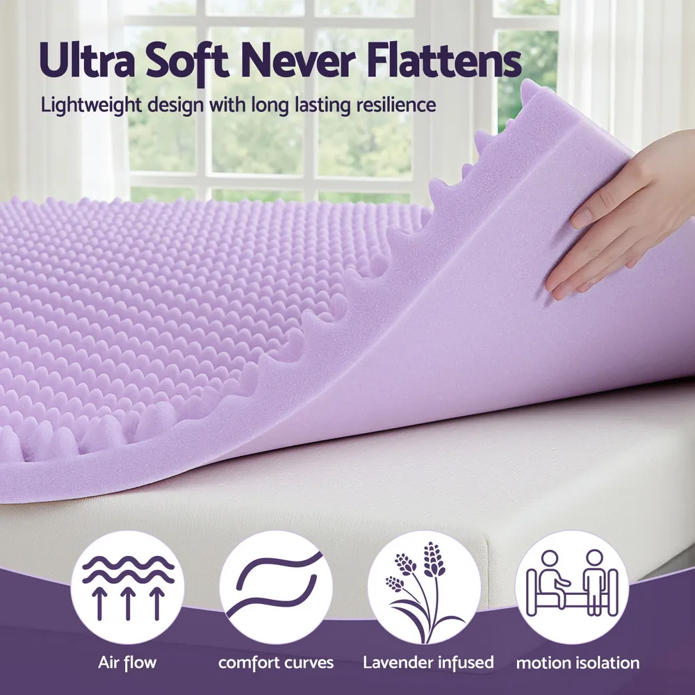 Experience deeper, more restful sleep with this 5cm Lavender-Infused Memory Foam Mattress Topper. Designed with a breathable egg crate structure, it enhances airflow while gently conforming to your body. The calming lavender scent promotes relaxation, making it perfect for unwinding after a long day. With over 1000 support points, the topper evenly distributes body weight and helps relieve pressure from key areas such as the shoulders and hips. Motion isolation ensures undisturbed rest, even if you share the bed. Ideal for hot sleepers, this topper offers cool, breathable comfort all night long.