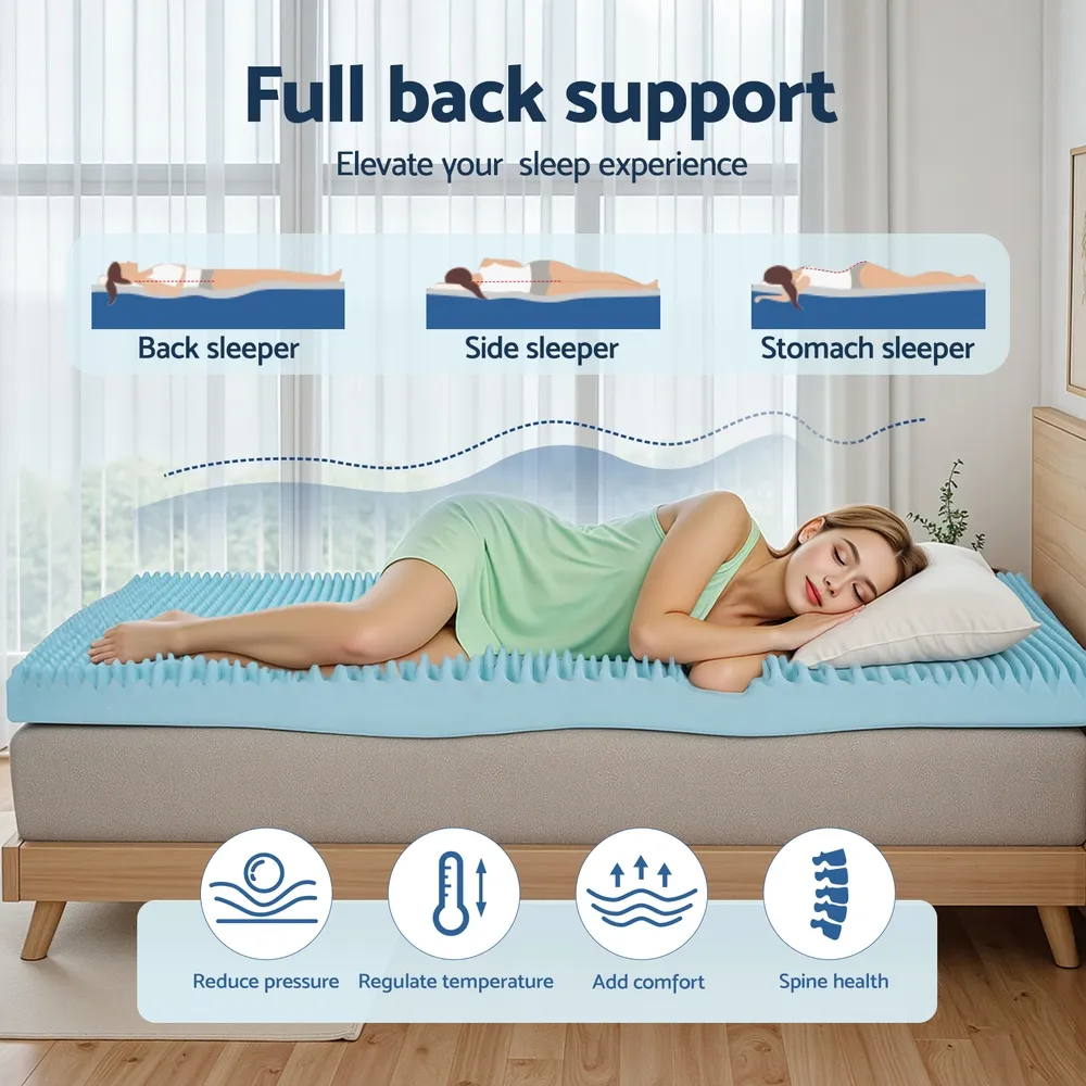 Giselle Bedding's 8cm memory foam mattress topper features cool gel infusion, breathable egg crate peaks, and over 1000 responsive support points. The bamboo cover is washable, offering pressure relief, airflow, and motion isolation for deeper rest