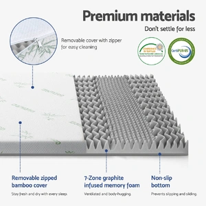 Experience elevated comfort with Giselle Bedding's 8cm graphite-infused memory foam mattress topper. Its 7-zone contoured surface with open cell structure improves airflow, while the memory foam offers lasting support and over 1000 contact points. Finished with a removable bamboo fabric cover and anti-skid base