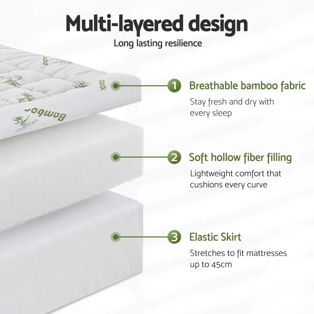 Elevate your sleep with the Giselle Bedding Pillowtop Topper, featuring an 11cm plush profile of 1500GSM hollow fiber beneath premium bamboo fabric. The 3D wave-check quilting enhances airflow while distributing weight evenly across your mattress. Designed for deep mattresses up to 45cm, this highly breathable topper arrives vacuum-packed for hygiene and is machine-washable for effortless maintenance.
