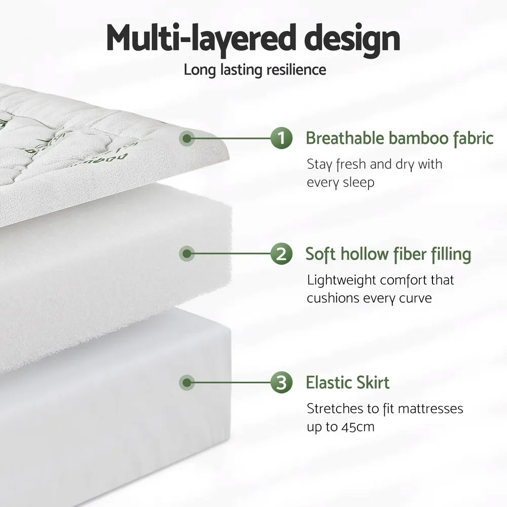Experience cloud-like comfort with Giselle Bedding's 5cm Pillowtop Topper. Featuring a premium bamboo cover and 1000GSM hollow fiber filling, this topper enhances your mattress with balanced support. The 3D wave-check quilting promotes optimal airflow while evenly distributing body weight. Perfect for mattresses up to 45cm deep, its highly breathable design ensures cool, comfortable sleep. Arrives vacuum-packed for freshness and is machine-washable for easy care.