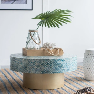 If youre looking for some island style in your home or space, then the Goa shell coffee table will do the trick. A heavy bottomed, beautifully shaped coffee table with a striking white background, its stand out feature is its unique covering of blue hued shell pieces. The beauty of shell is in its colour and ability to reflect light. The island feeling will not disappoint.
