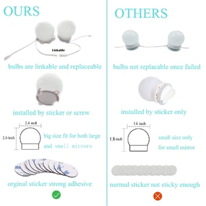 - @ FLEXIBLE INSTALLATION STRING LIGHT BULB. It is plug in vanity light.bulbs could be install by 3m sticker, just peel and stick,please try to place the vanity light bulbs more towards the border and then proceeded to tuck the wires behind the mirror,or just twist the bulb the cords will be around the bulbs if you have a large mirror with a wood frame,you could mount the bulbs by screw, mount then next to the wood frame will look really nice.
