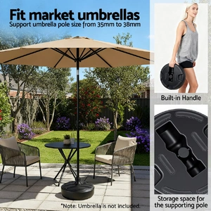 Secure your umbrella with our Instahut fillable base, designed for maximum stability. Easily add water for steadfast support, even on windy days. Relocating? The integrated hand grip ensures effortless mobility. Always check compatibility to ensure it fits your outdoor umbrella. Crafted for both strength and convenience, it's the essential anchor for your outdoor shade needs.