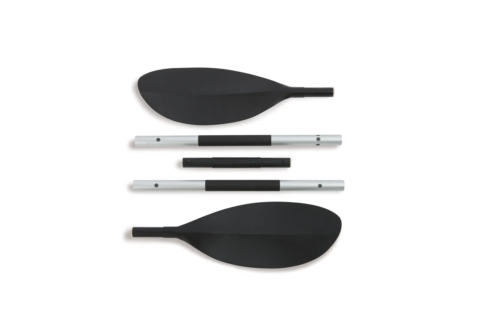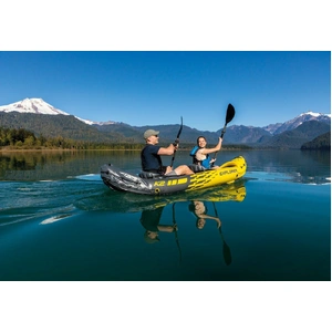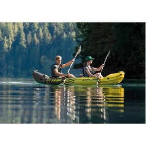 The Intex Explorer K2 Kayak is sporty and fun with a streamlined design for easy paddling. The bright yellow color and sporty graphics makes the kayak highly visible in the water. Great for experiencing lakes and mild rivers with a friend, this Sports Series kayak is perfect for two adults. Lightweight and compact, this kayak is a snap to assemble, and allows you to take the fun of kayaking wherever you go. Made with rugged vinyl construction, this sturdy kayak has an inflatable I-beam floor for comfort and rigidity. A removable skeg provides directional stability, while two adjustable, inflatable seats with backrests are included for comfort. Quick inflating or deflating is a breeze with a Boston valve on each side. A grab line and grab handle at each end is provided for your convenience, as well as a U.S. Coast Guard I.D., and a repair patch kit. The Explorer K2 Kayak provides added accessories including: two 86in aluminum oars and an Intex high-output pump for easy inflation and deflation.