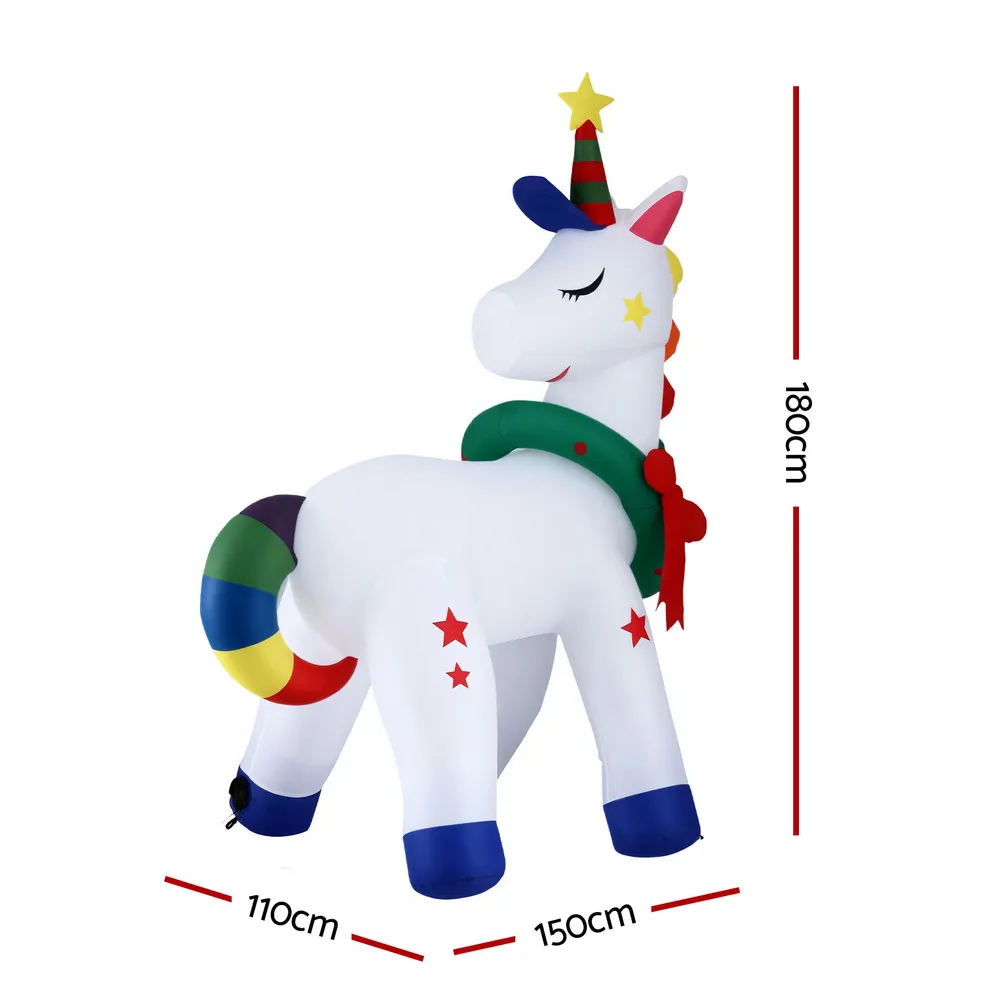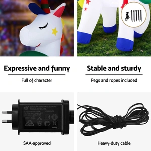 Unleash the magic of Christmas with a whimsical scene of Unicorn! This delightful inflatable comes to life as the sun sets, illuminated by a cheerful built-in LED glow that spreads joy all night long. Designed for effortless fun, it inflates in moments and deflates just as easily for simple storage. Crafted to withstand the elements and including everything you need for a secure setup, it's the perfect way to create a stunning, hassle-free holiday spectacle. Don't wait—order today and beat the Christmas rush!