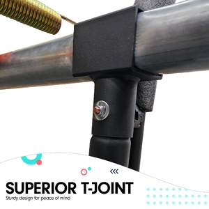 This is a heavy trampoline and uses linked legs and grounding straps for superior stability. The structure of the legs also minimises the tendency for the legs to dig into the ground.