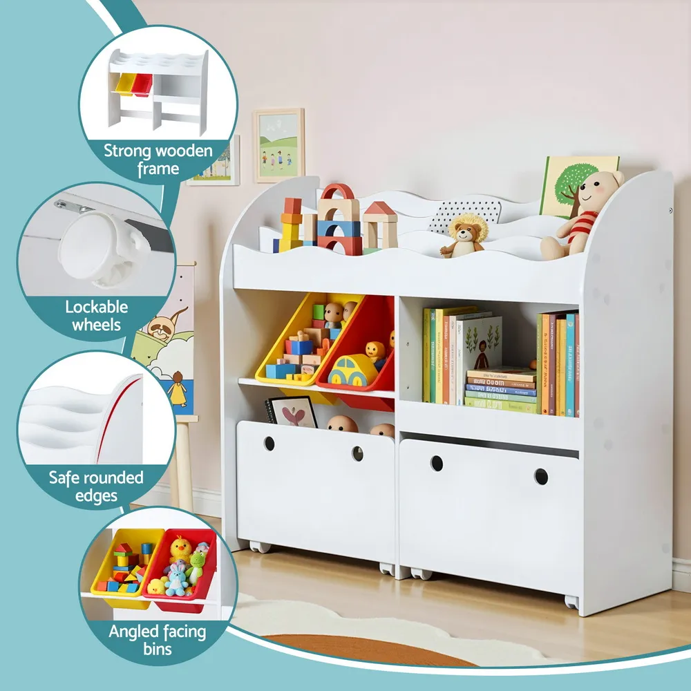 Encourage your little ones to read and learn to organize things with our Kids Display Shelf. With display shelves, storage boxes and removable drawers, the ensemble is made of durable MDF board. The boxes are made of PP plastic and are removable. Plus, the spacious drawers are also removable and provide even more storage options. The overall design is made child-safe with smooth round corners and easy-to-reach accessibility. Not least, the lockable wheels enable the unit to be firmly in place with every use.