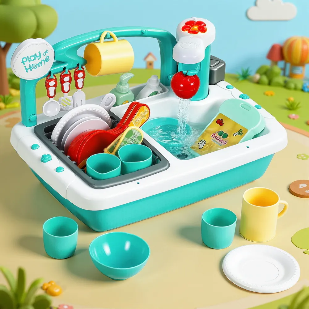 Bring real-life fun to playtime with this Kids Pretend Play Sink Toy! It features sensor control, realistic washing functions, and an automatic water cycle system for endless interactive play. The removable legs design lets kids play on the floor or tabletop. With induction and washing play, children can experience a lifelike kitchen routine while improving hand-eye coordination and social interaction. Includes rich accessories for imaginative role play (battery not included) — perfect for fun parent-child time!