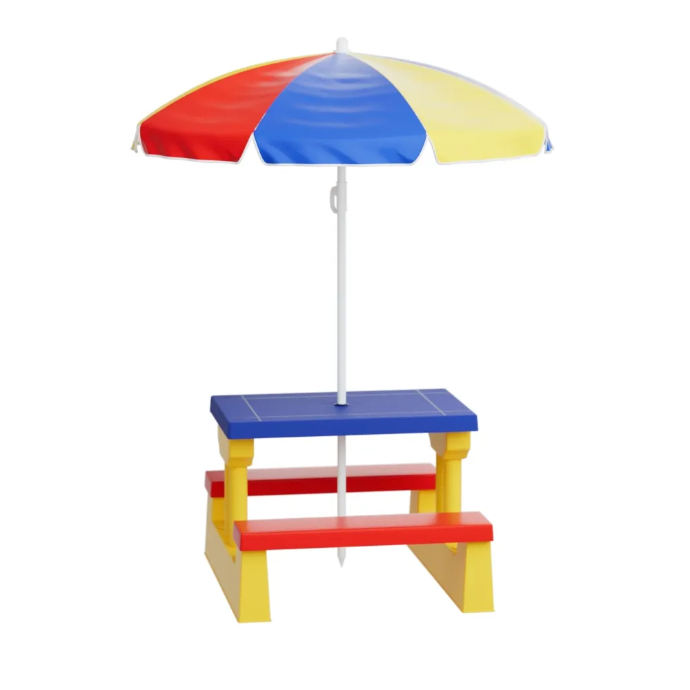 Suitable for both indoor and outdoor use, this set is perfect for playtime, arts and crafts, and outdoor meals. The vivid colour is guaranteed to brighten up any space while also providing a fun and playful element to your child's environment. Made with sturdy and durable materials, our set ensures a long-lasting solution for your child's needs. Your child can play in the sunshine all day, thanks to the handy adjustable umbrella which also has a light-blocking and water-resistant feature, providing ample shade and protection. The height can easily be adjusted to suit your child's needs, making this set perfect for growing children. Don't let bad weather ruin your fun! The water-resistant umbrella ensures that even on the gloomiest of days, outdoor playtime remains protected.