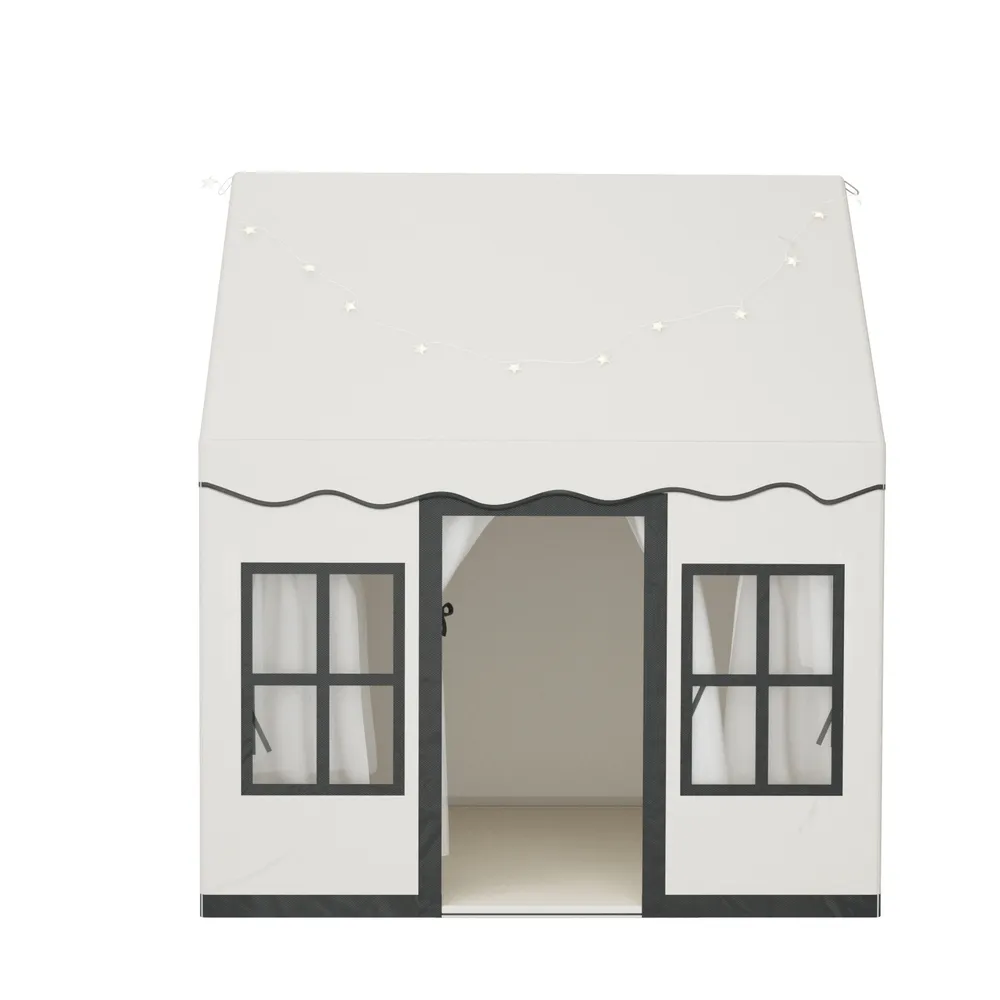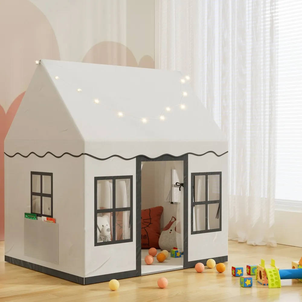Give your children the gift of creativity and imagination with the Keezi Kids Playhouse! This amazing playhouse provids large space for 3-4 children to play together. Made from durable polyester fabric, the playhouse is designed to last long hours of play both indoors and outdoors. The sturdy PVC poles with firm connections in triangle structure form an ultra stable frame. Besides, the anti-slip mat increases stability and comfort. The door and windows are equipped with breathable mesh curtains which promote good air circulation inside the tent and allow parents to keep an eye on kids conveniently. Meanwhile, the playhouse is designed with 2 side pockets to store kid's toys, story books and other small items. Decorated with a string of shiny star lights, this castle looks much more charming and dreamy, making it a wonderful gift for children and a perfect partner for learning and playing indoors. Easy to store, clean and maintain, you and your kids will love the convenience of the Keezi Kids Playhouse!