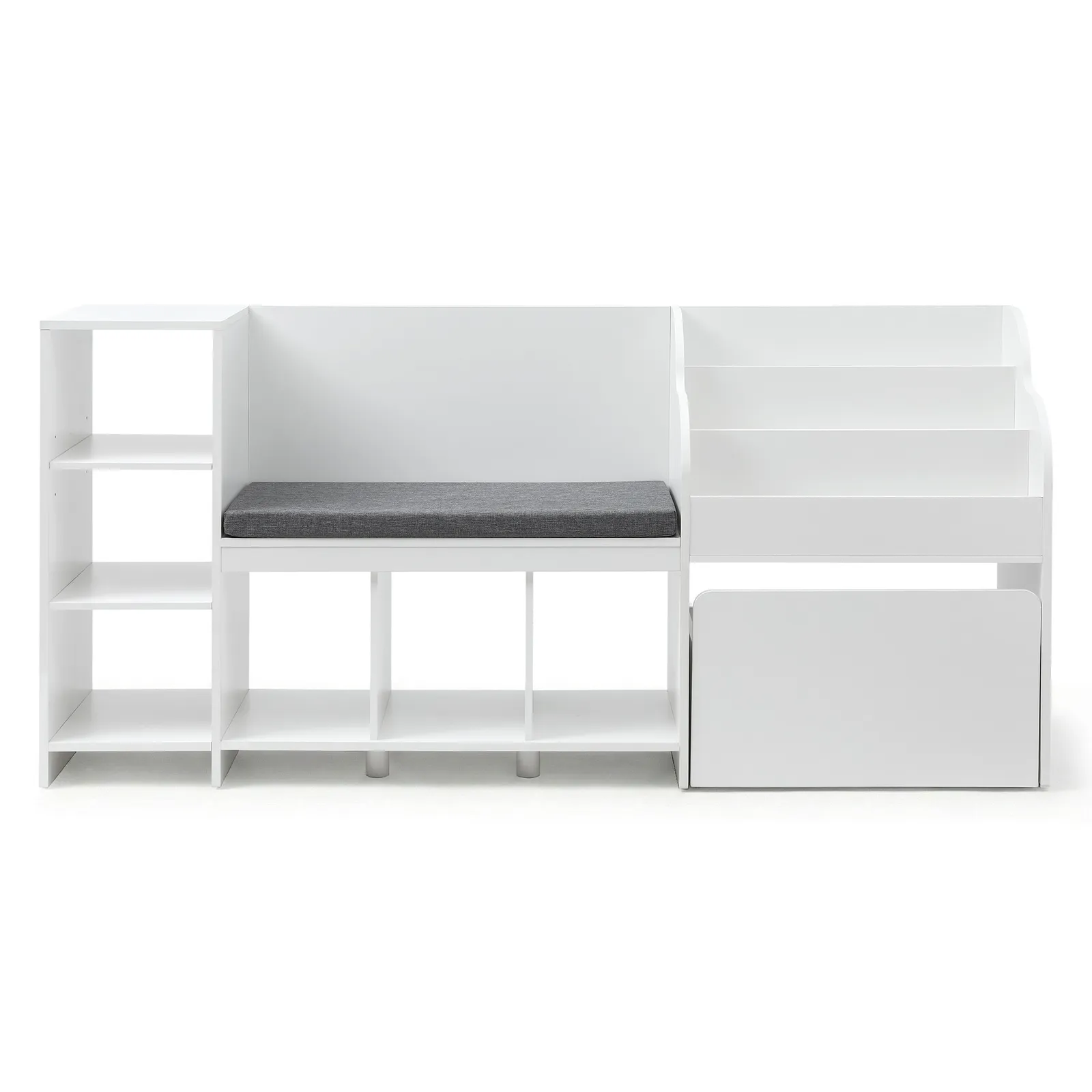 Layout: Bench, 3 Toy Compartments, 3 Cubbies, Shelves, 1 Drawer